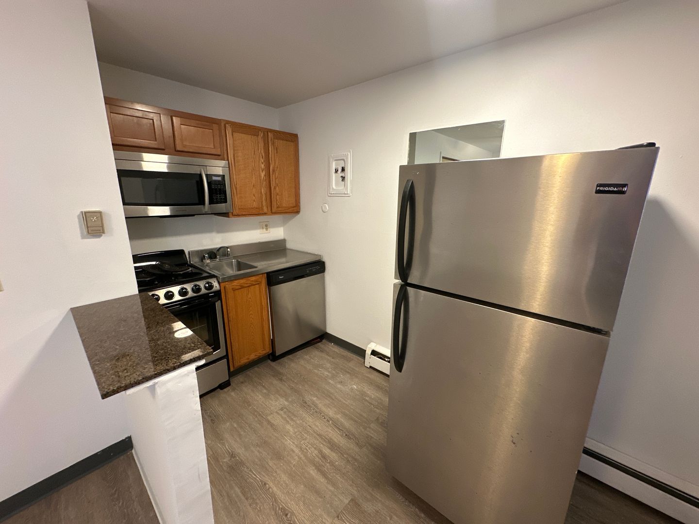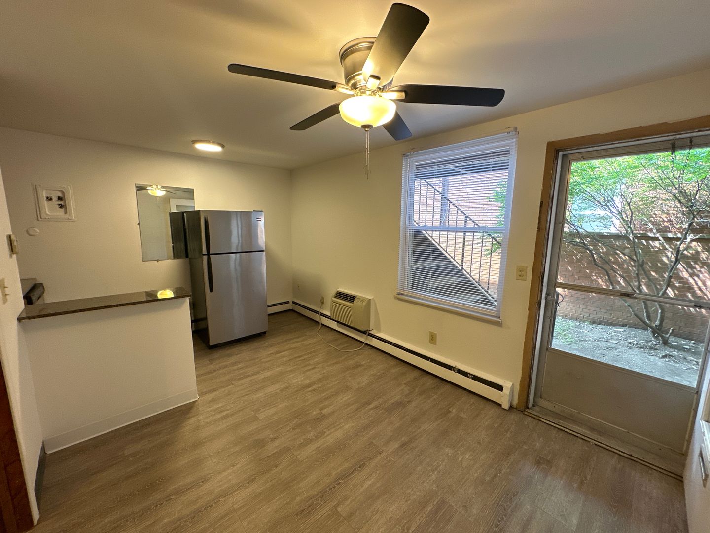 It features an efficiency-sized kitchen equipped with a stainless steel dishwasher and refrigerator. Additionally, there is a window air conditioner, a washer/dryer on-site and off-street parking available for purchase.