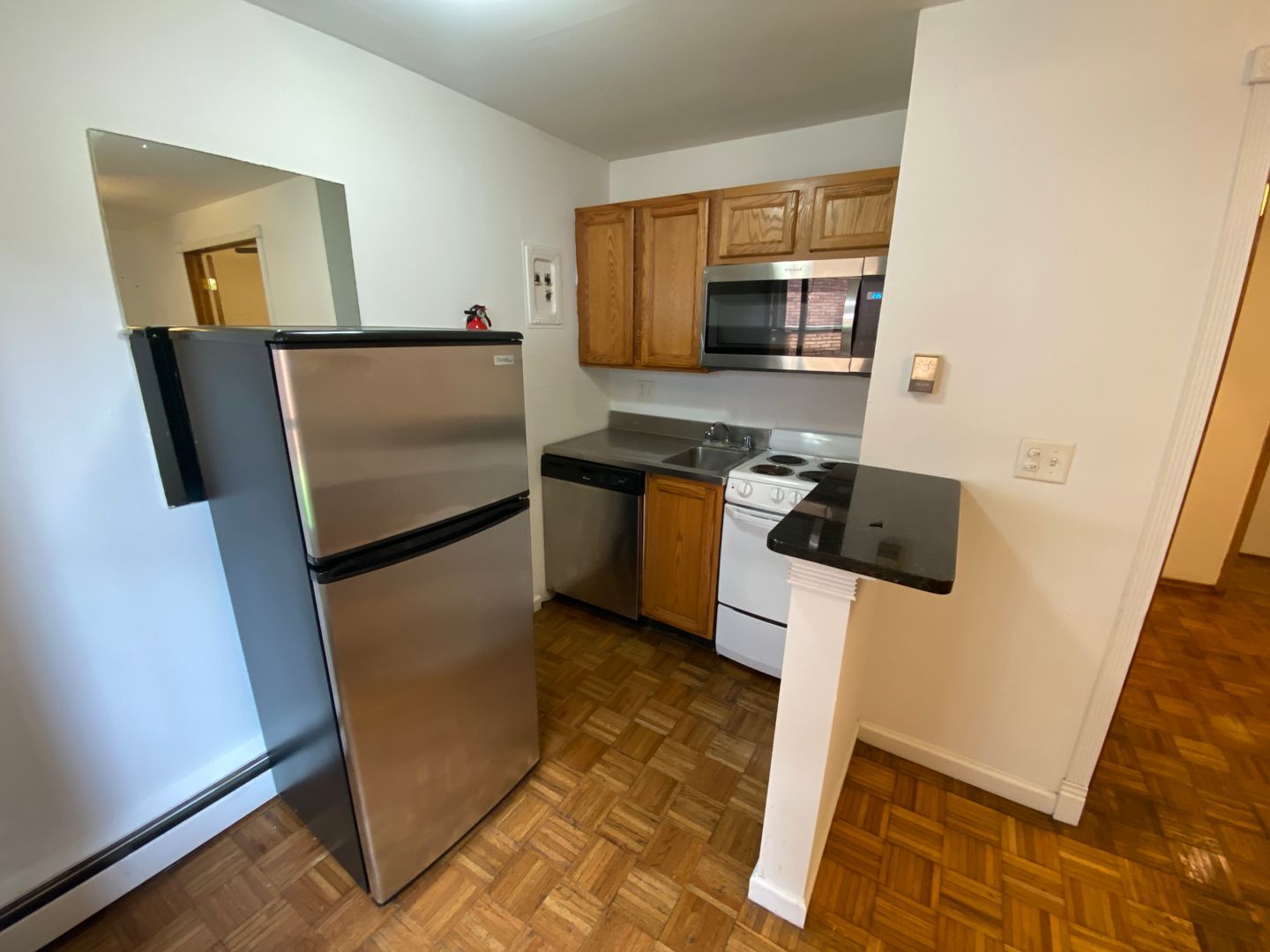 Kitchen includes stainless steel refrigerator, built in microwave and dishwasher along with an electric stove.