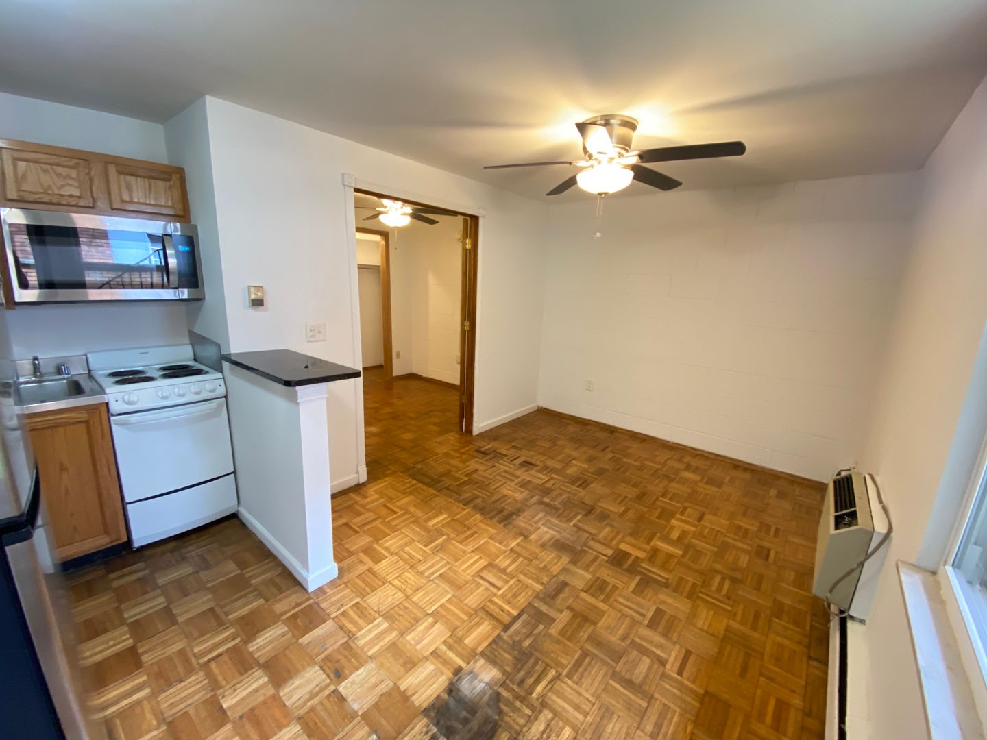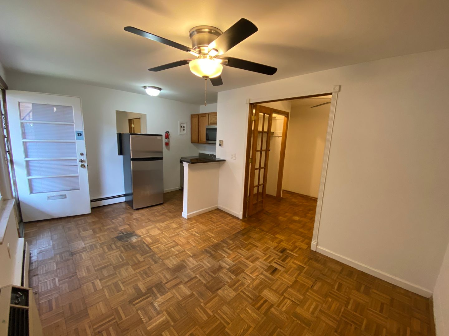 It features parquet hardwood floors, French doors, granite breakfast bar and ceiling fan.