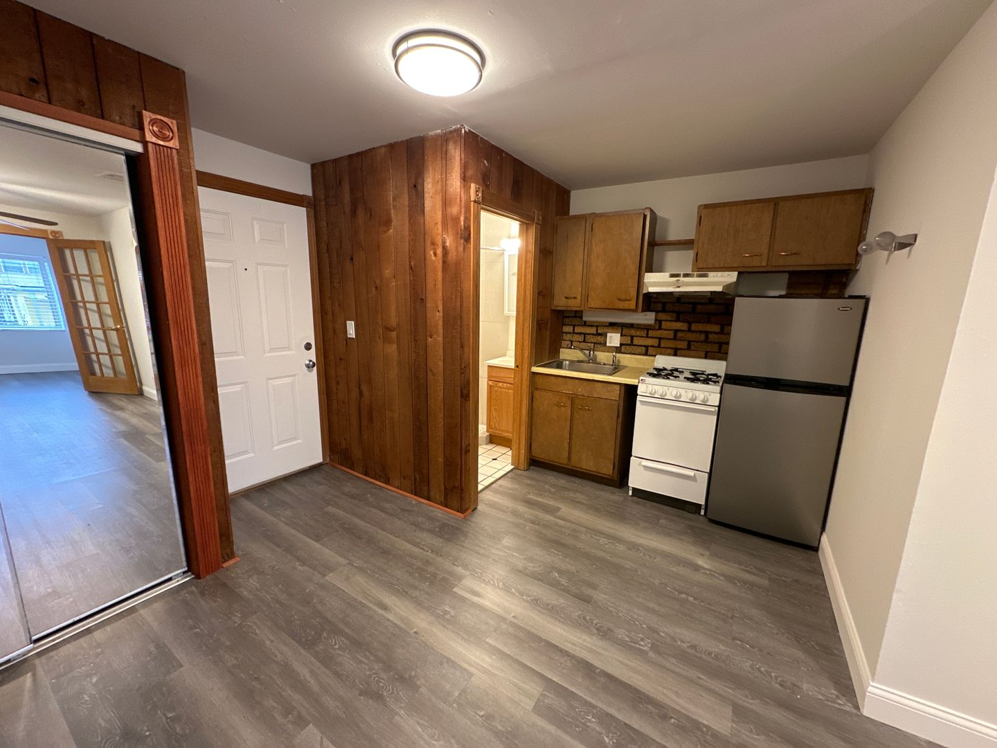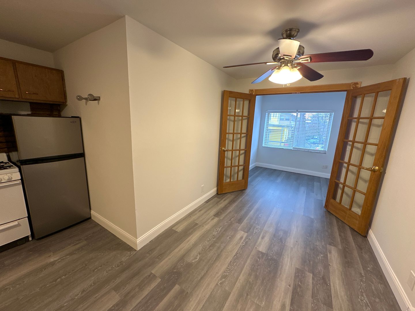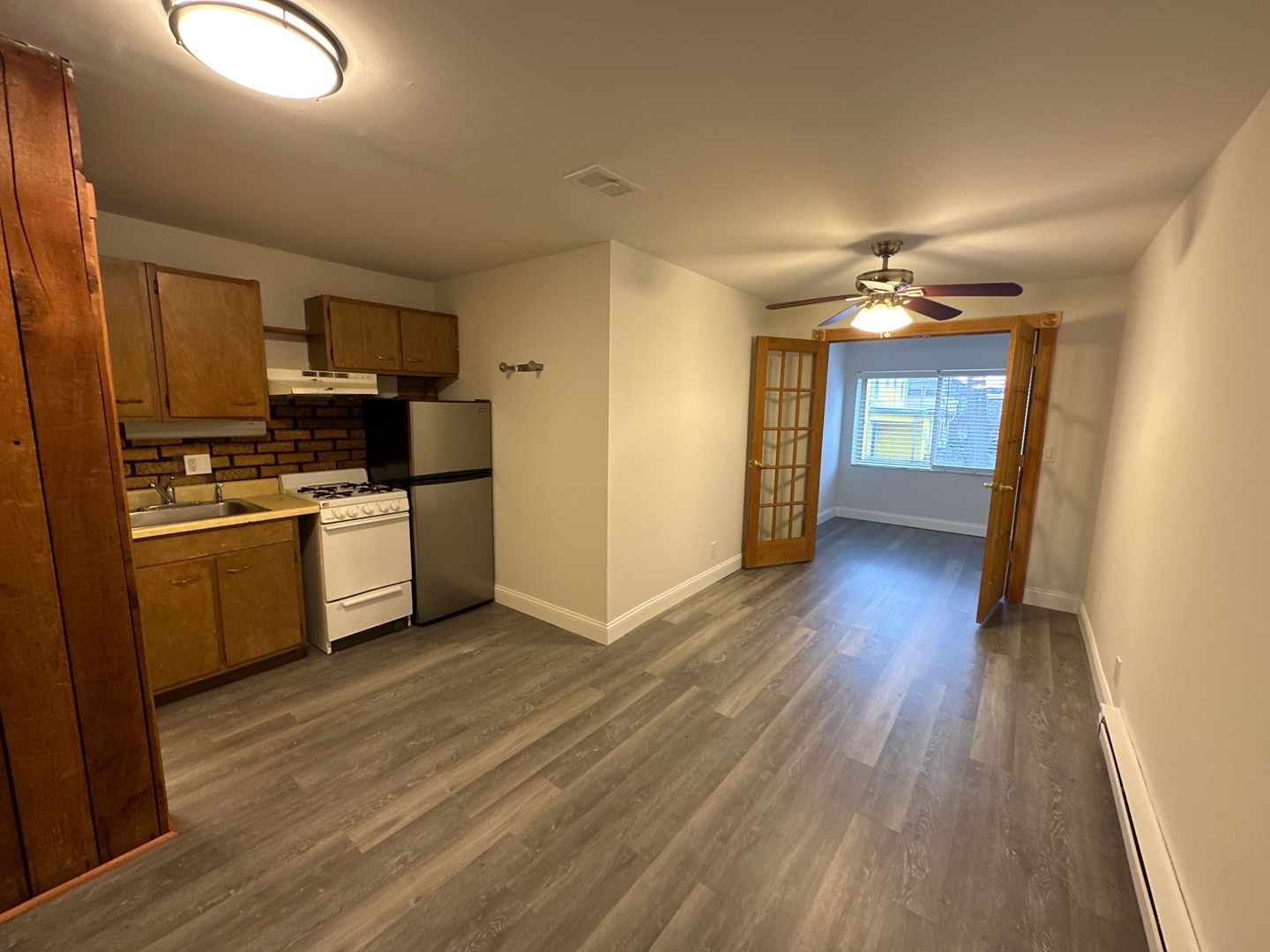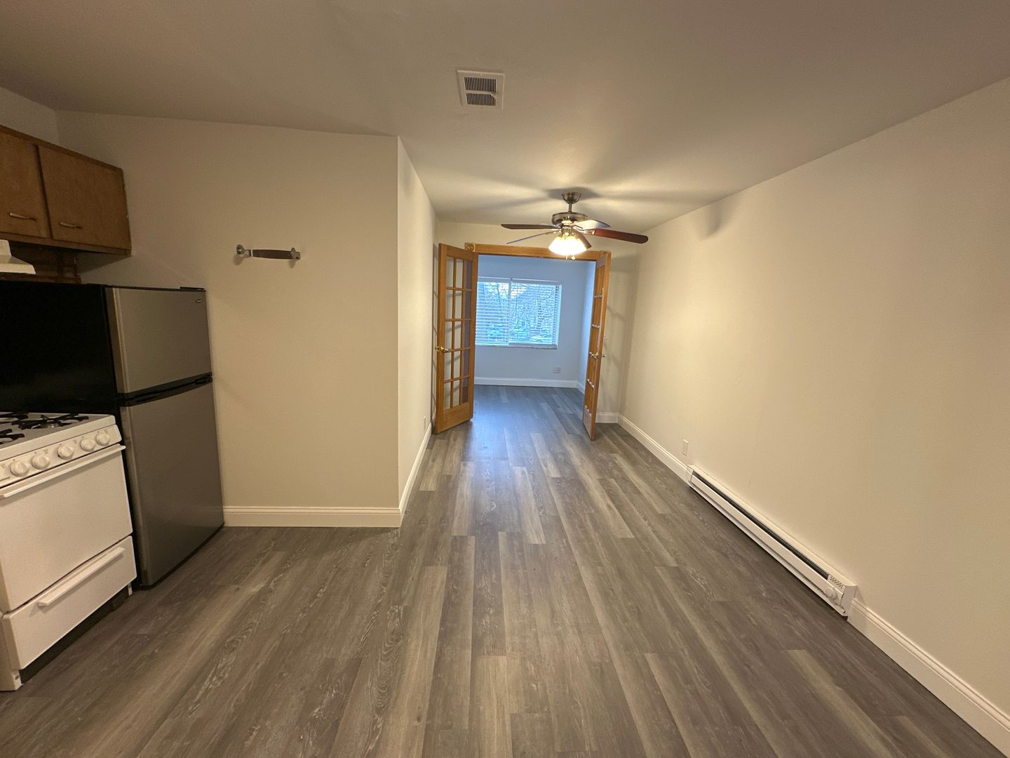 This unit is the efficiency unit in the building. With French doors, this apartment is cozy and cost effective. This unit includes central air, ceramic tile in bath and kitchen, ceiling fans as well as mini-blinds. Shared washer/dryers in the building for tenants use. Off street parking is available for purchase.