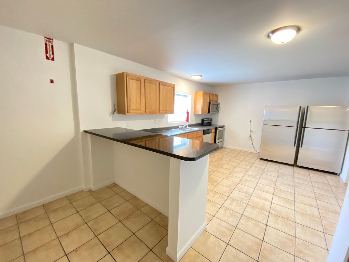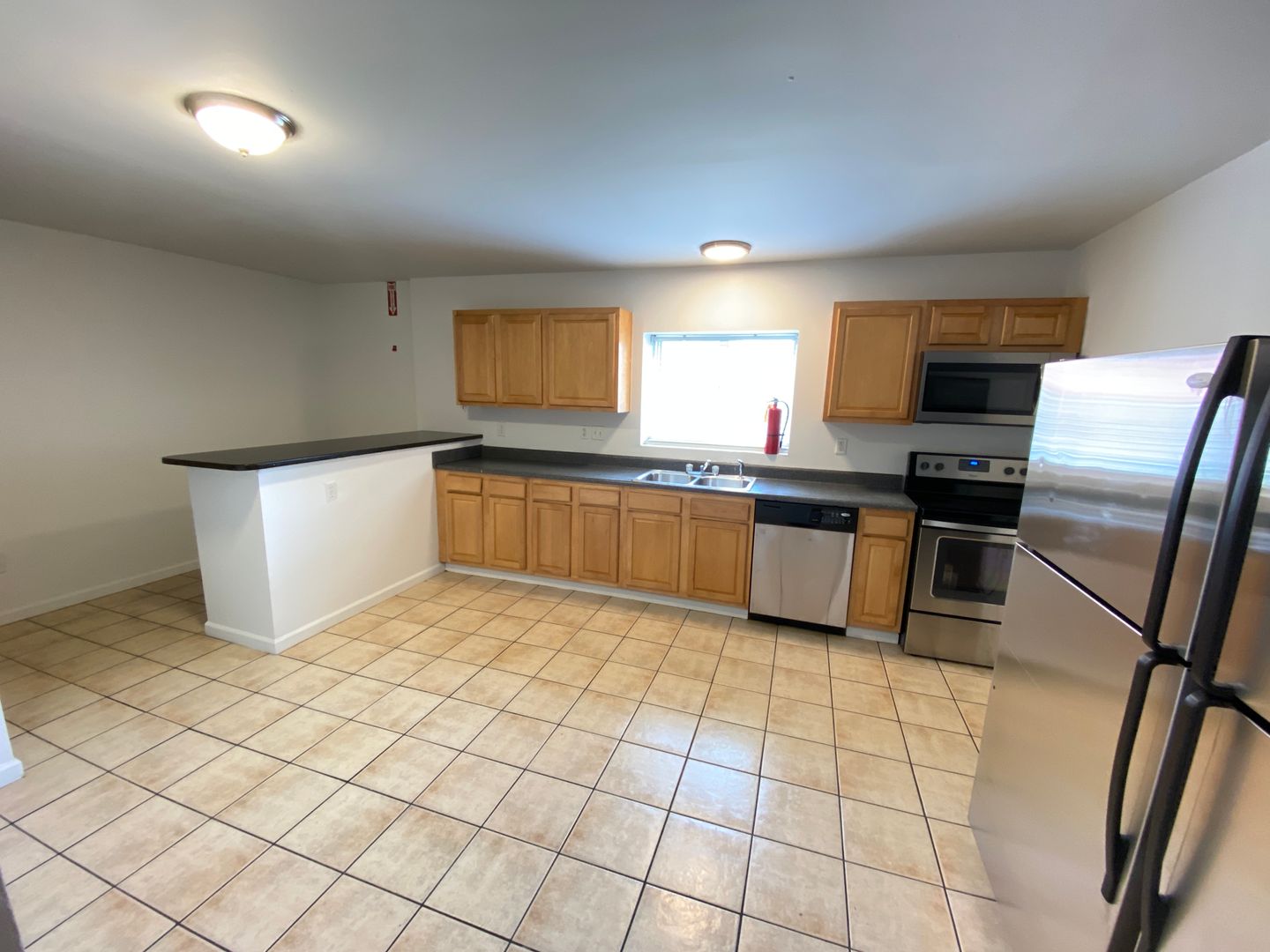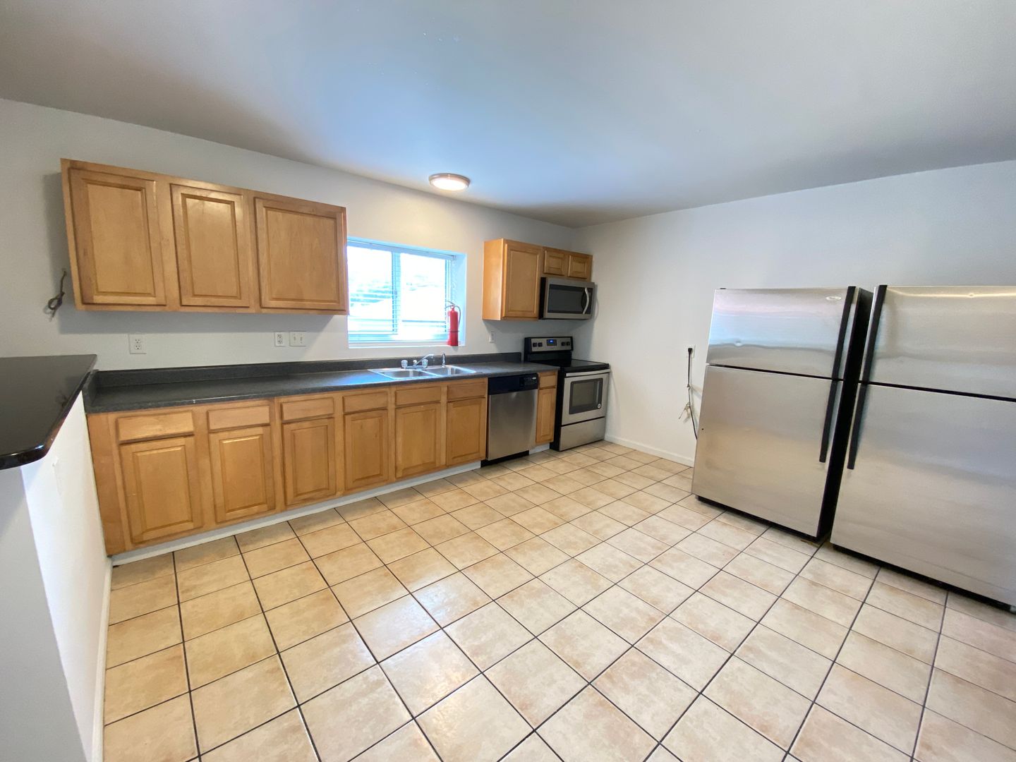 The kitchen are equipped with stainless steel refrigerator, microwave, and dishwasher all laid out on ceramic tile. Ceiling fans in every bedroom, and an included washer/dryer.