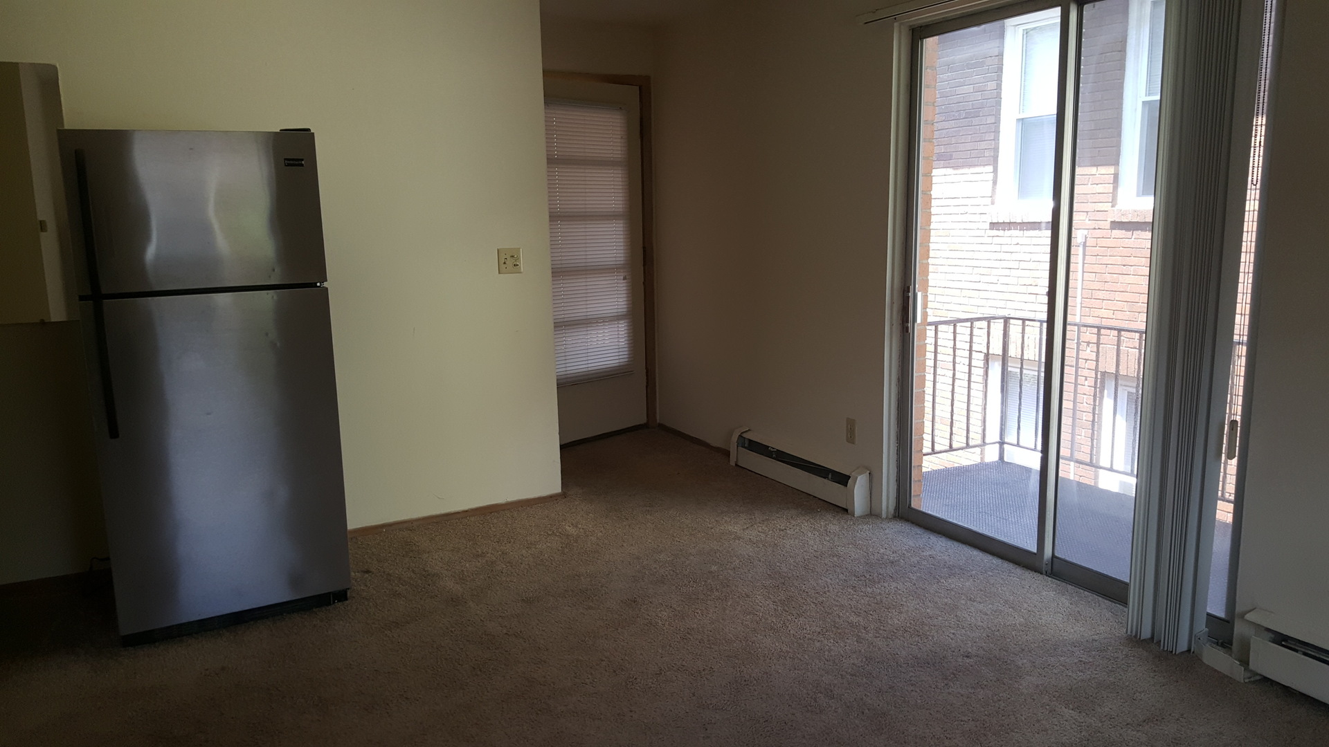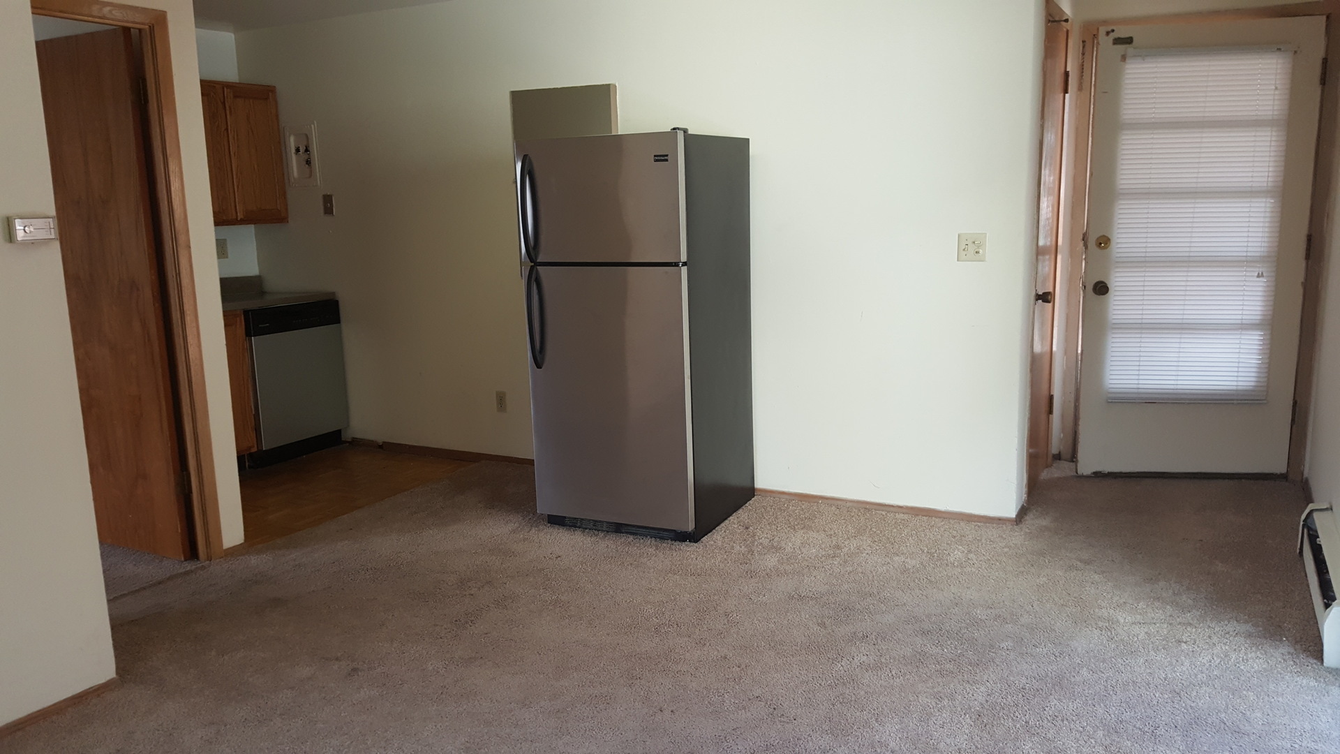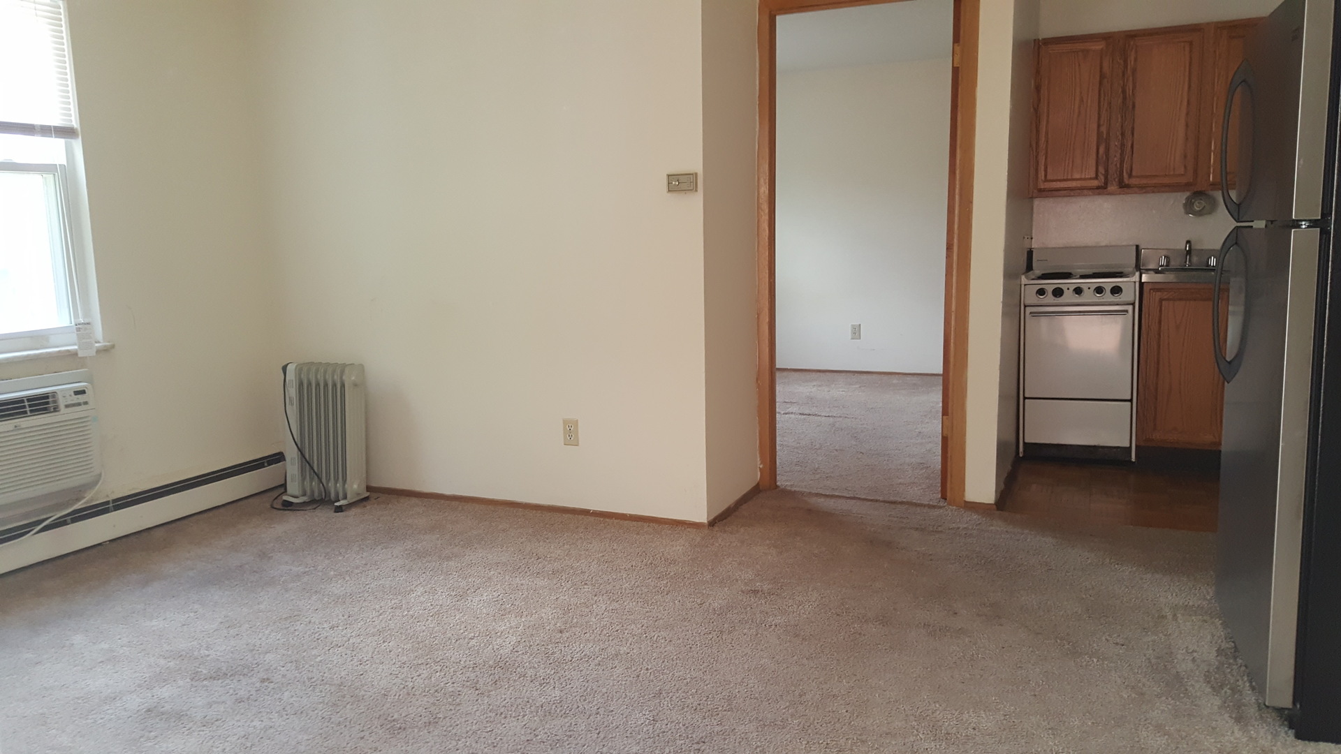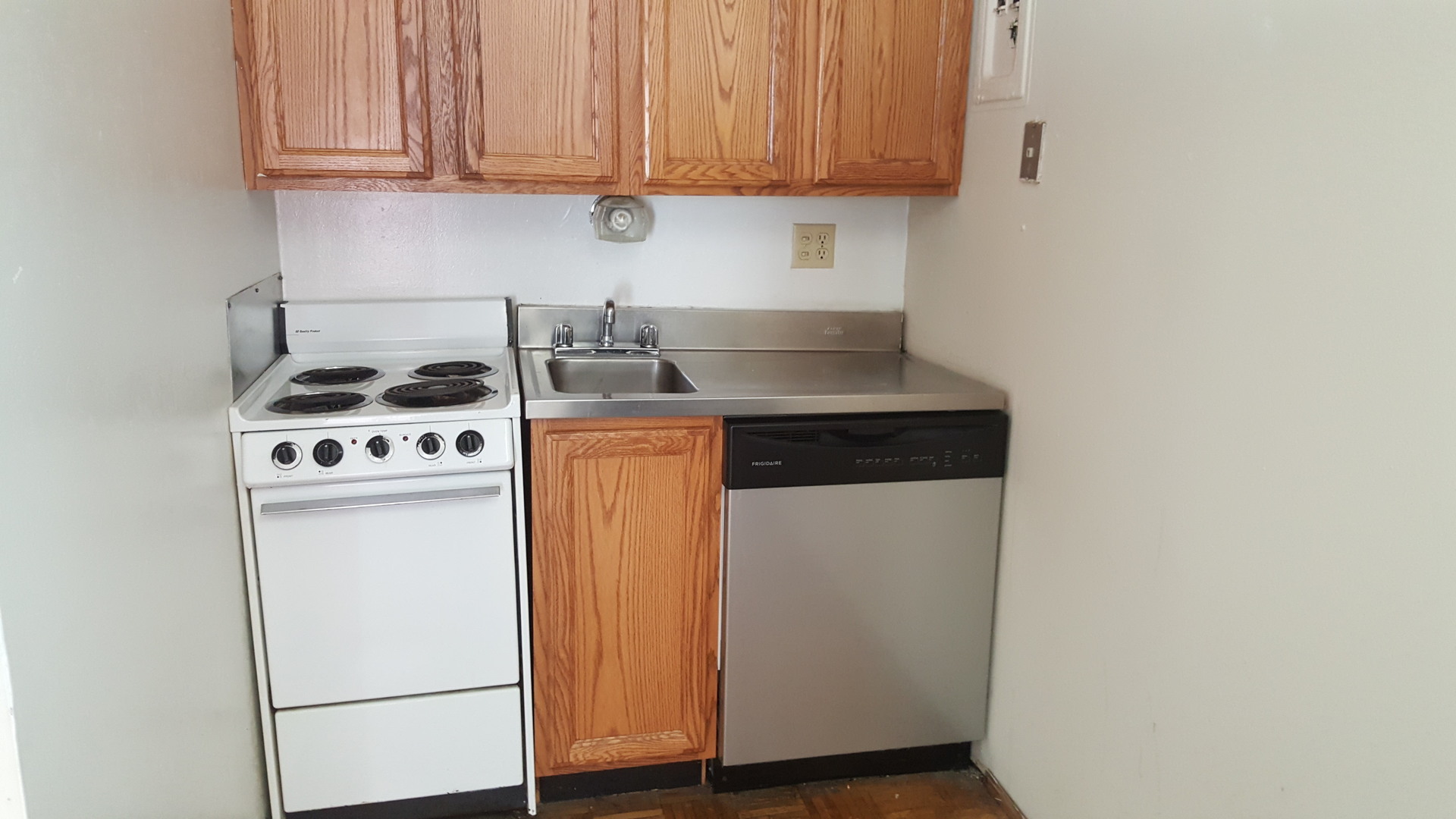 It features parquet hardwood floors in the kitchen and carpet in the bedroom. Kitchen includes electric stove, stainless steel refrigerator and dishwasher.