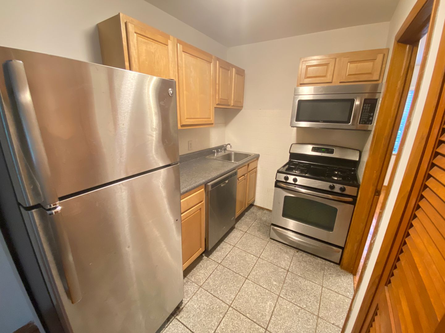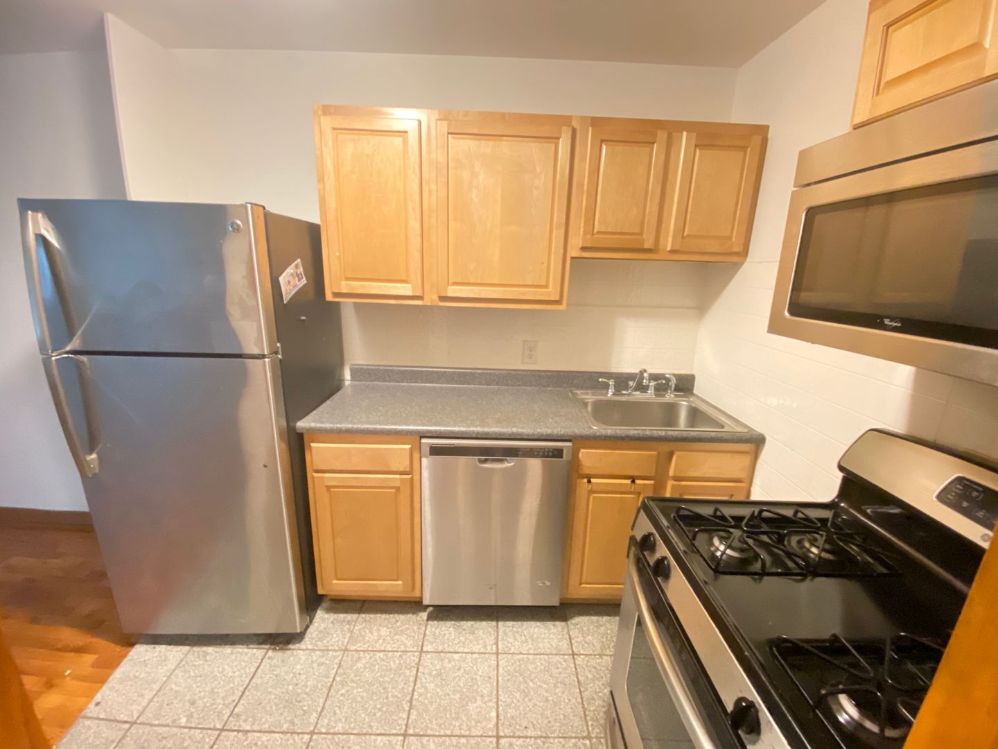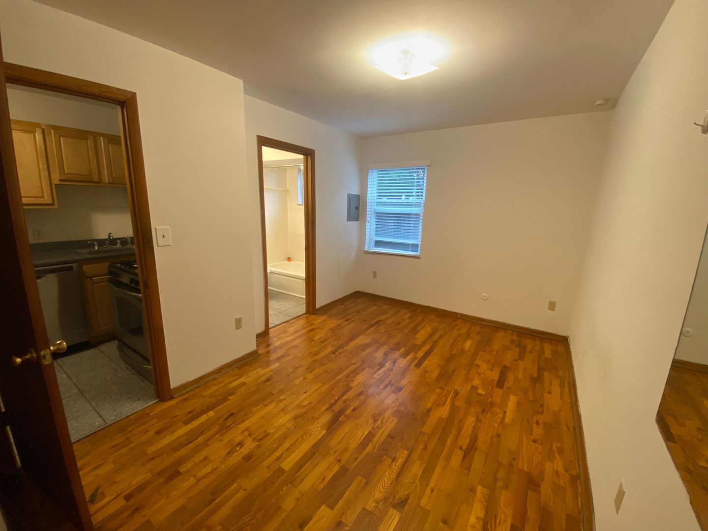 This is a standard flat with a nice living room that opens up to the kitchen. Spacious closet in the bedroom and a bathroom with shower and tub. Some updates include a built-in microwave, hardwood, and off-street parking is available for purchase. Hurry, this will definitely go fast at this price!