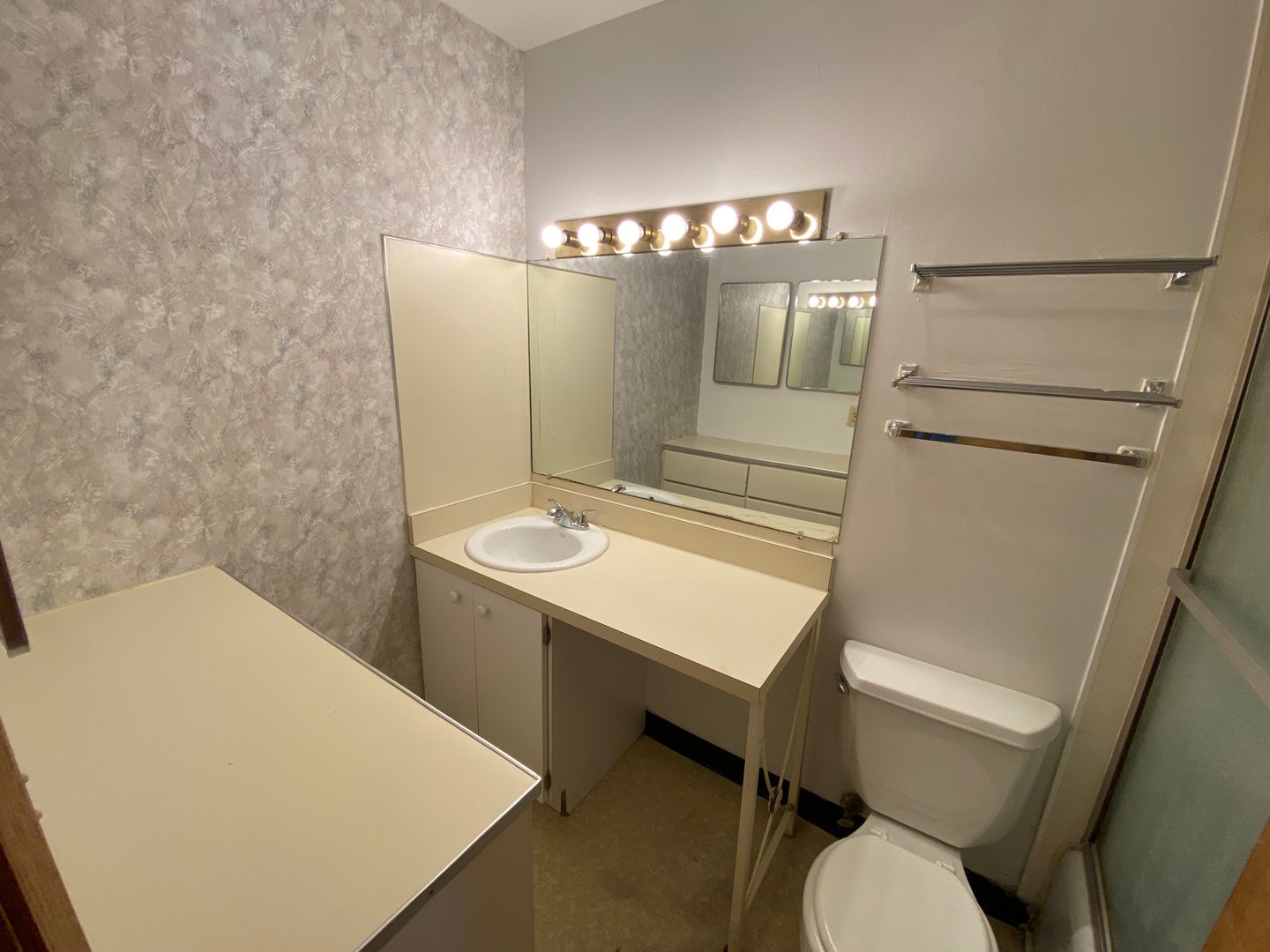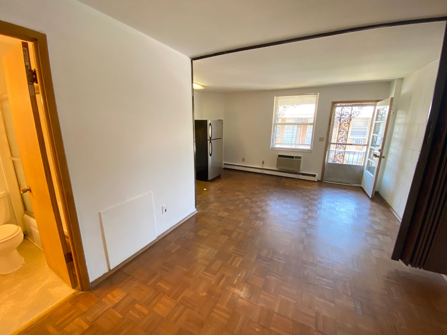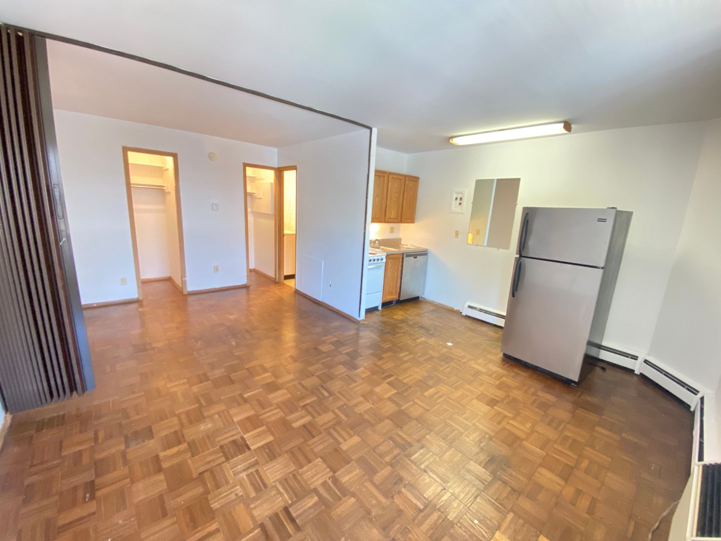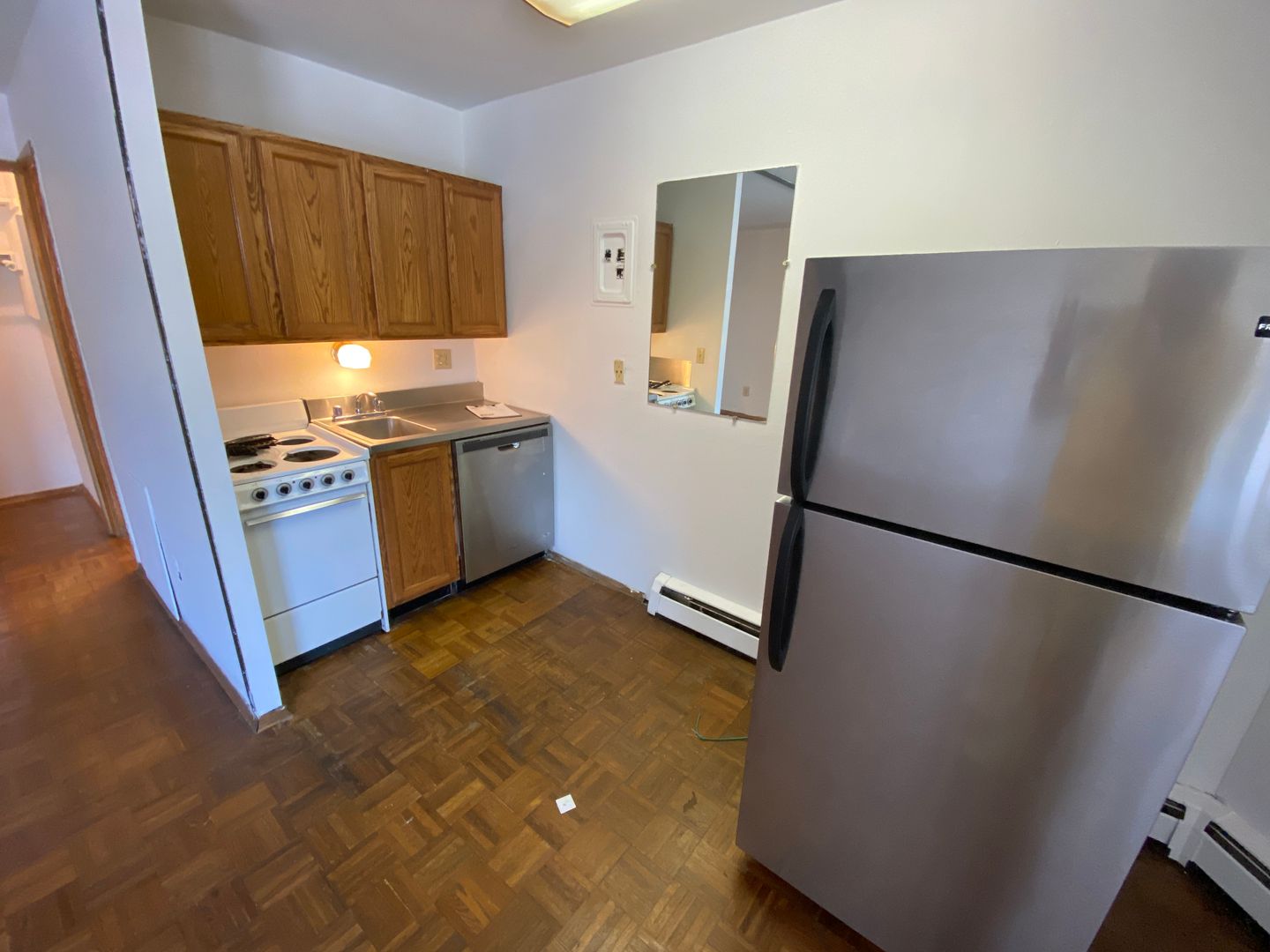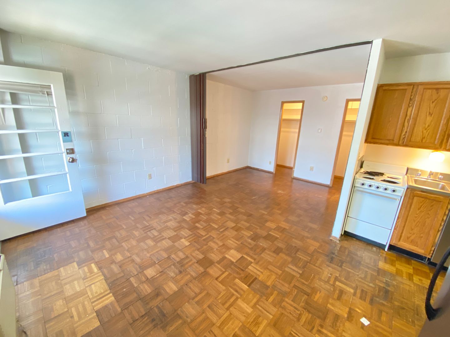 An efficiency-sized kitchen, and a full bathroom, this unit will have plenty of space for you to live alone. This is a middle unit on the top level of the building.