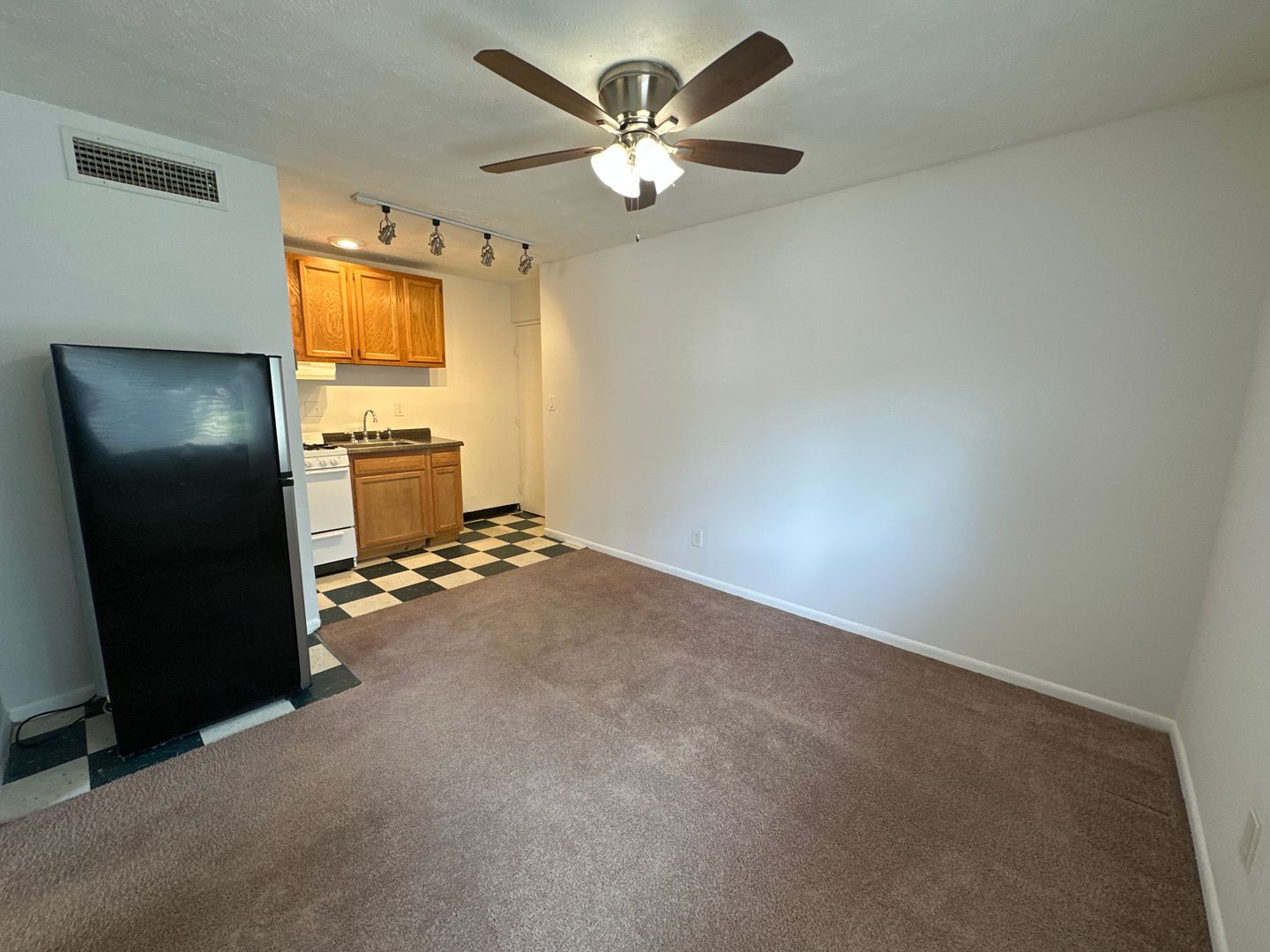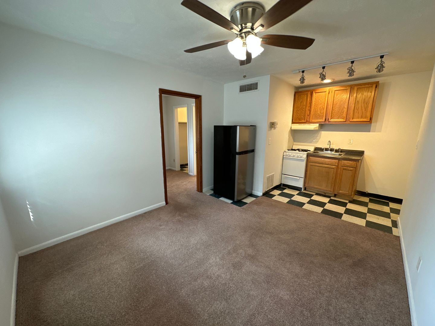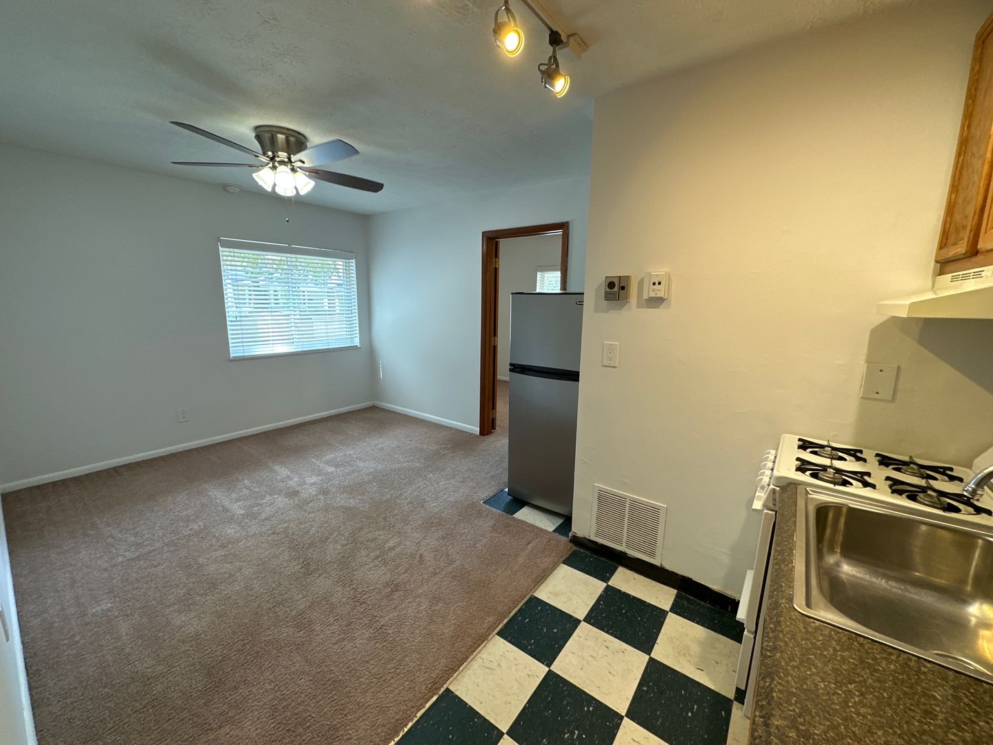 Located just four blocks north of Lane and west of High Street, this unit is ideal for one person. This lower-floor corner unit has a large walk-in closet and ceiling fans. Kitchen with Formica countertop and stainless steel refrigerator. Ceiling fan in the living room, and Roman shutters in the window.
