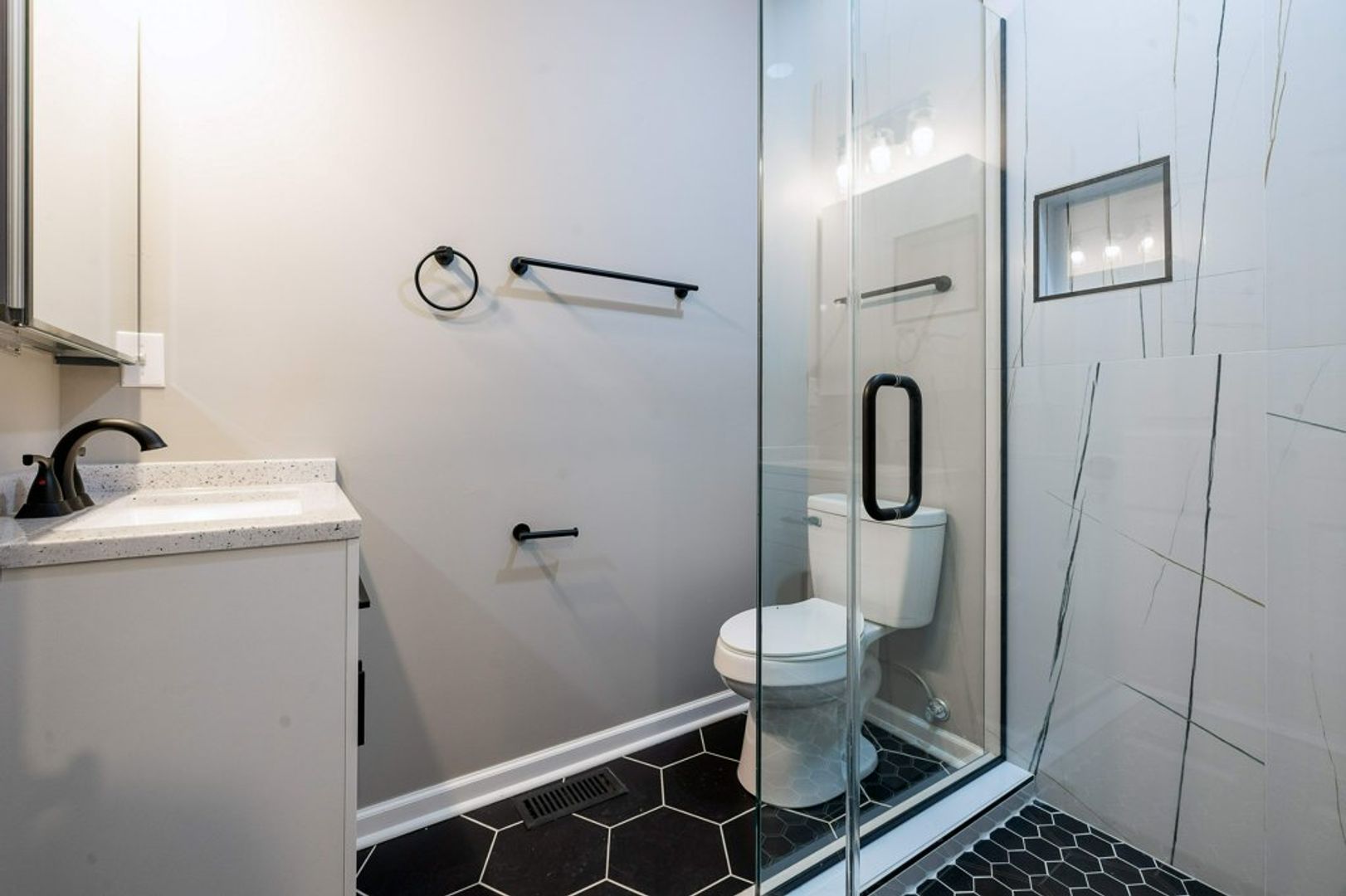 Take a look at the photos to see the exposed brick, hardwood floors, central air conditioning, fenced in backyard, off-street parking, and extraordinary character this duplex offers. The stylish renovated Carrera tiled bathrooms have Bluetooth ready exhaust fans so you can play your favorite music.