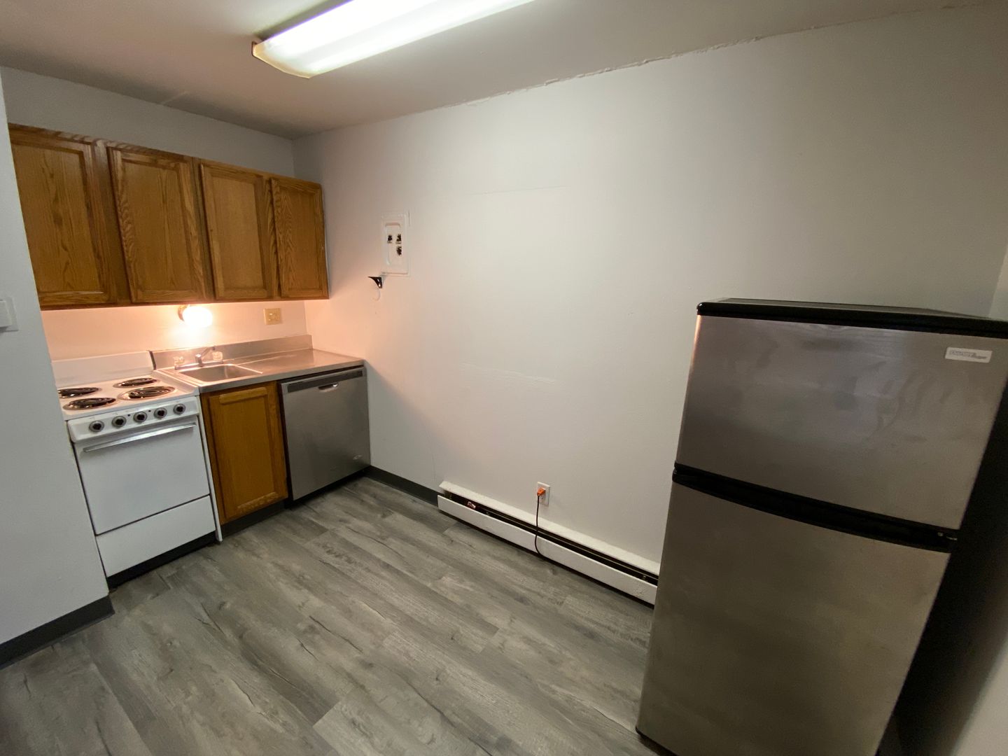 It features an efficiency-sized kitchen equipped with a built in microwave, stainless steel dishwasher and refrigerator. Additionally, there is a window air conditioner, a washer/dryer on-site and off-street parking available for purchase.