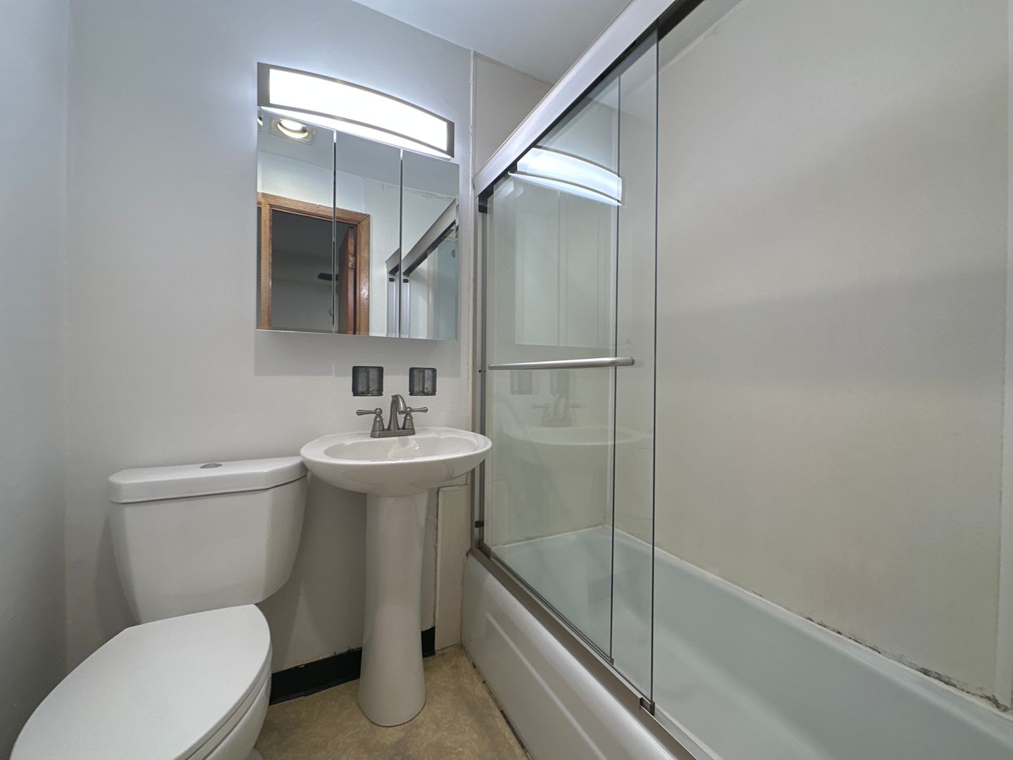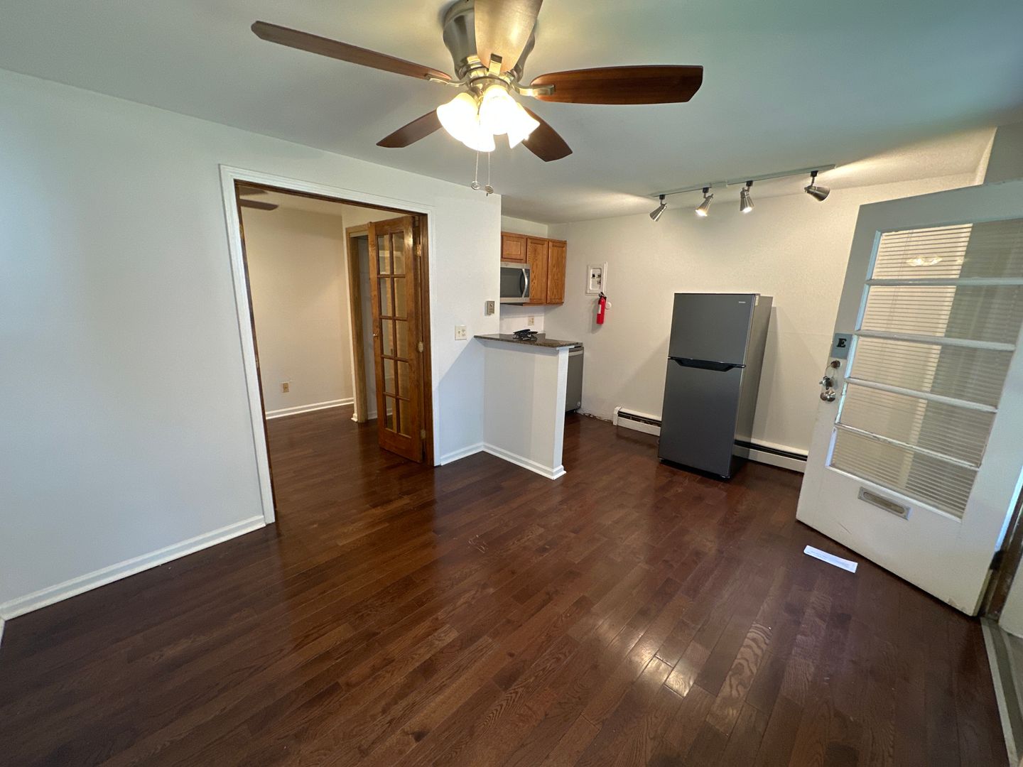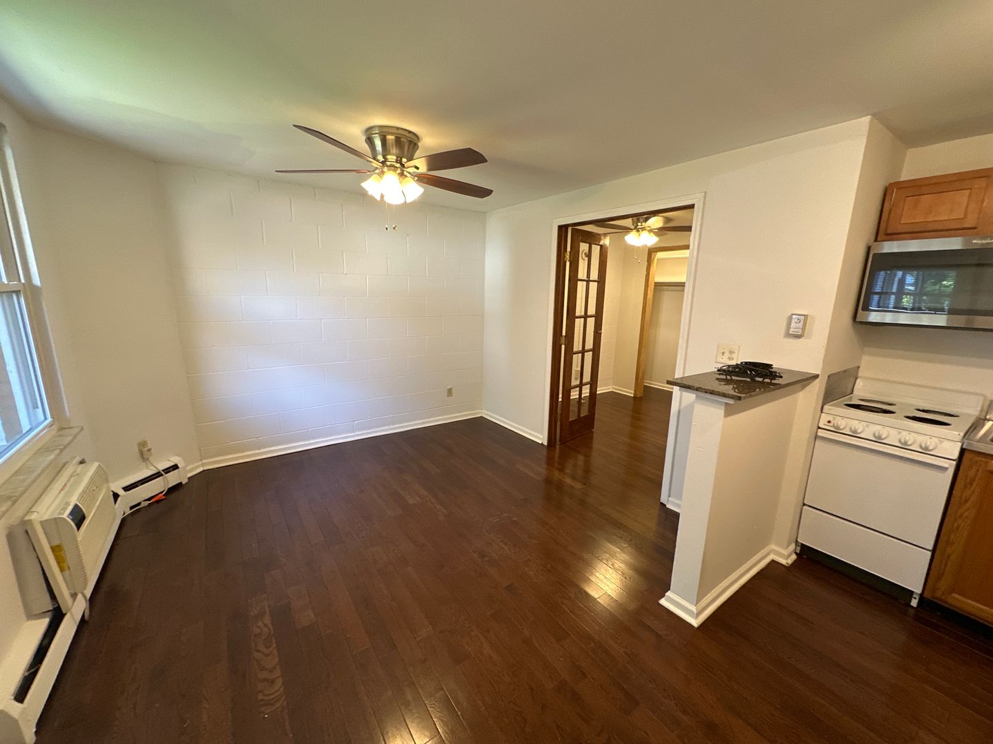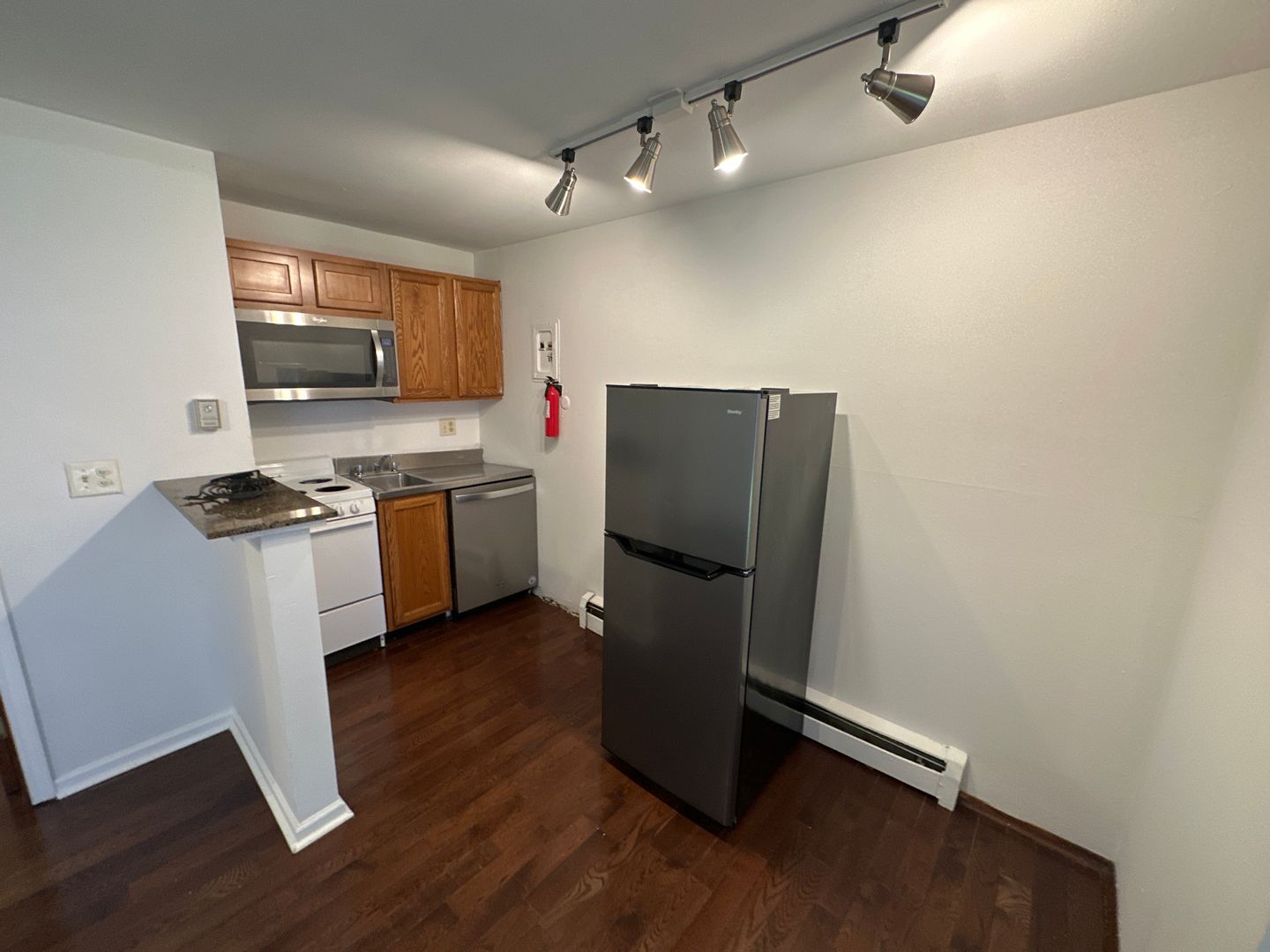 It features an efficiency-sized kitchen equipped with a built in microwave, stainless steel dishwasher and refrigerator. Additionally, there is a window air conditioner, a washer/dryer on-site and off-street parking available for purchase.