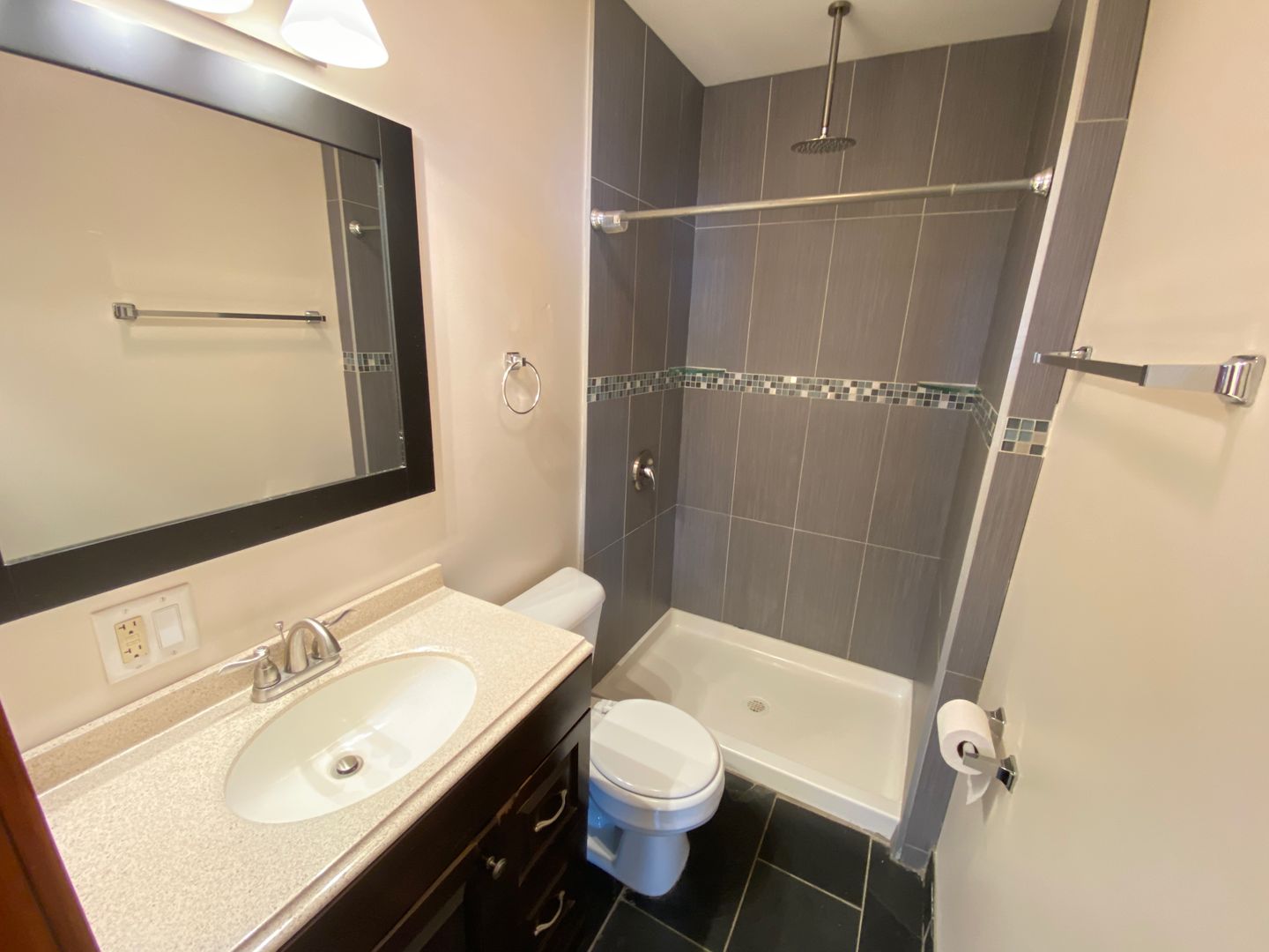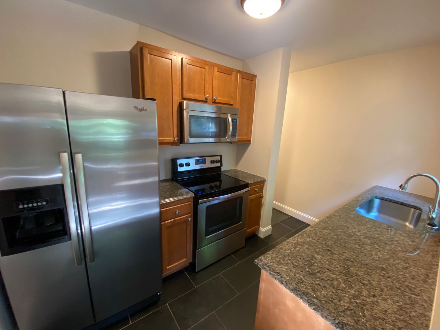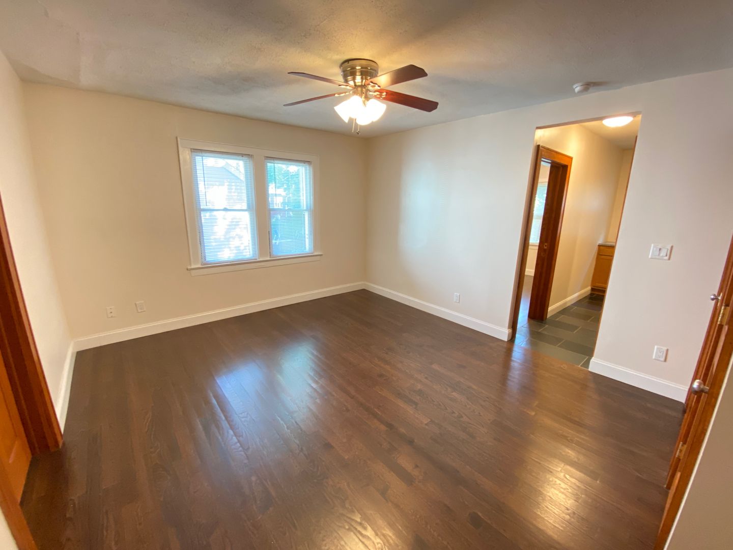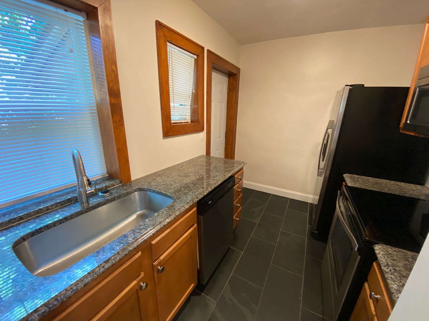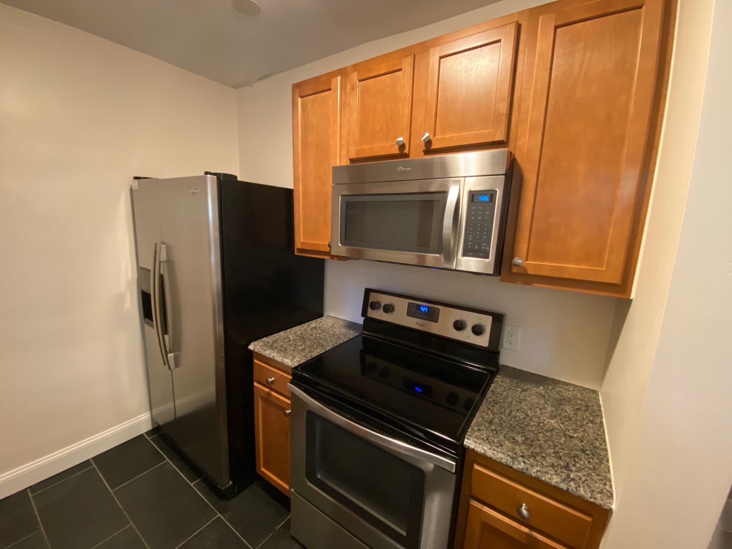 North Campus OSU renovated flat with hardwood floors, ceiling fans, stacked front loading washer/dryer, mirrored closet doors in the bedrooms, bathroom with beautiful black slate tile, stunning vanity and a waterfall shower. Kitchen with stainless steel appliances,