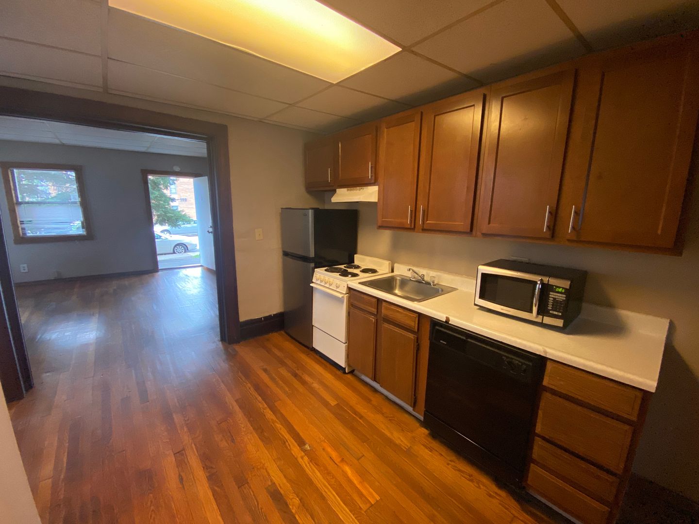 Features a shared balcony and there is parking available in the back lot for purchase. The apartment has a full bath, a dishwasher, large closets, and huge rooms.