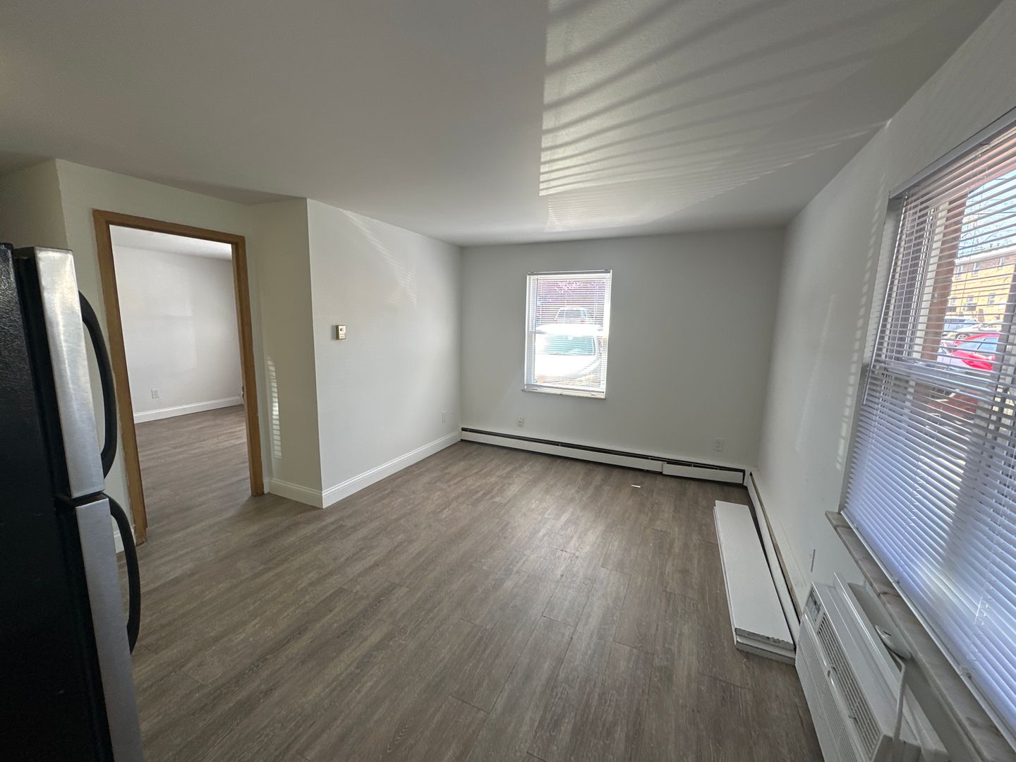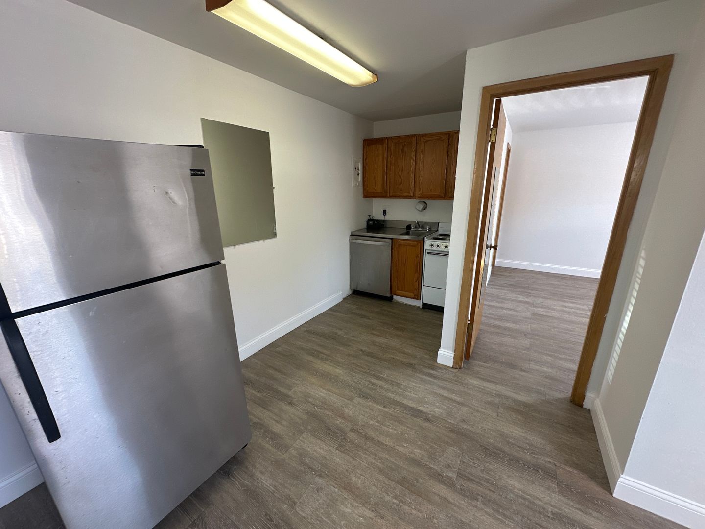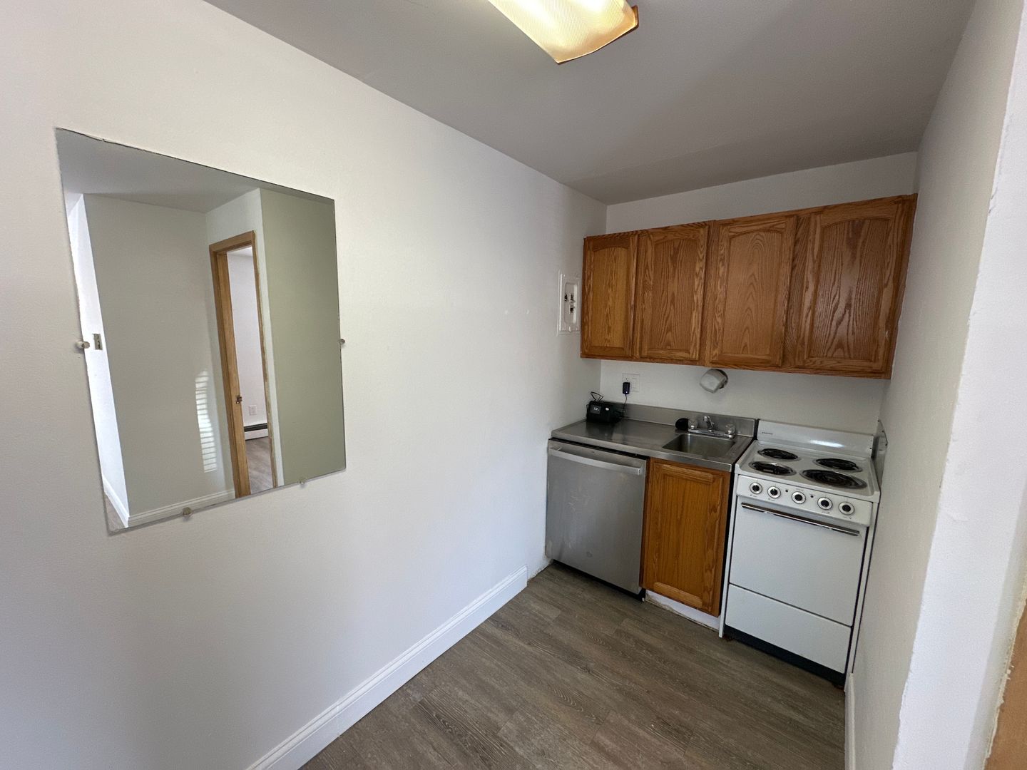 It features parquet hardwood floors in the kitchen and carpet in the bedroom. Kitchen includes electric stove, stainless steel refrigerator and dishwasher.