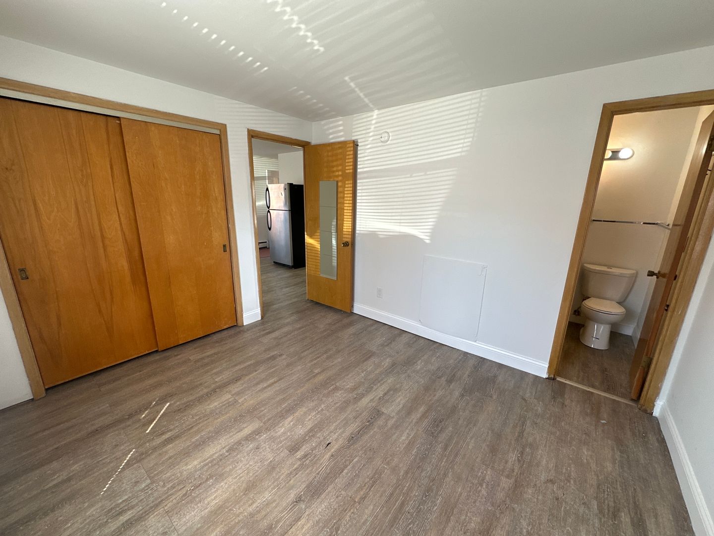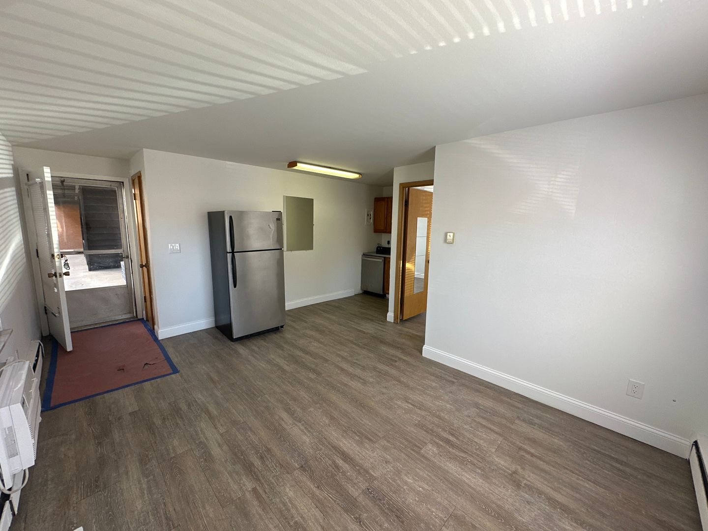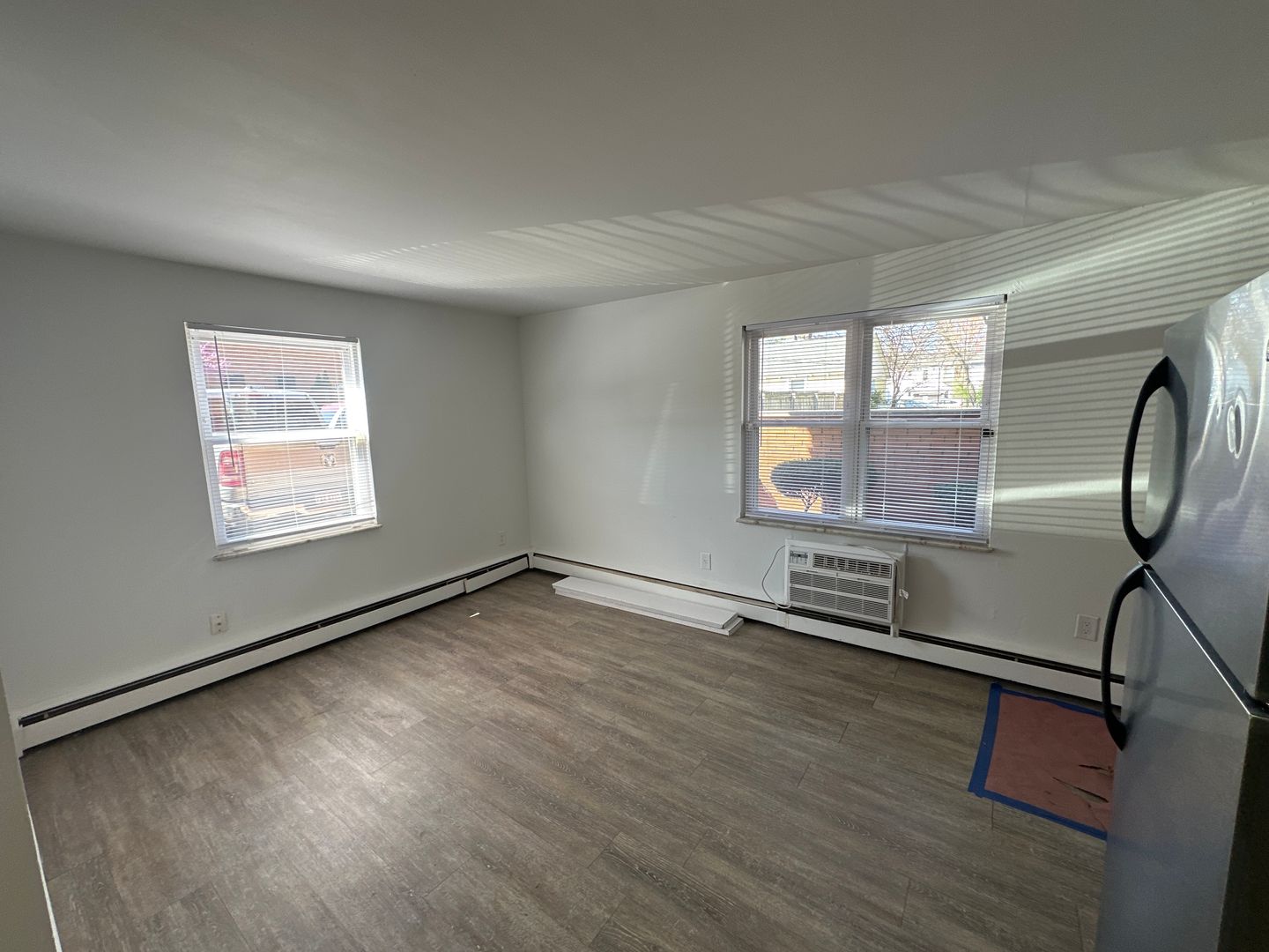 It features parquet hardwood floors in the kitchen and carpet in the bedroom. Kitchen includes electric stove, stainless steel refrigerator and dishwasher.