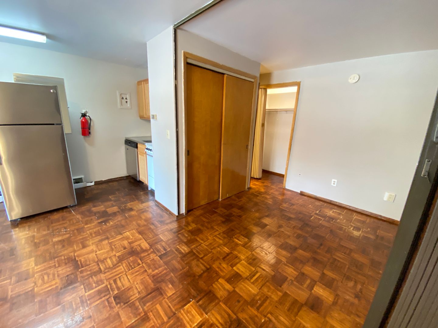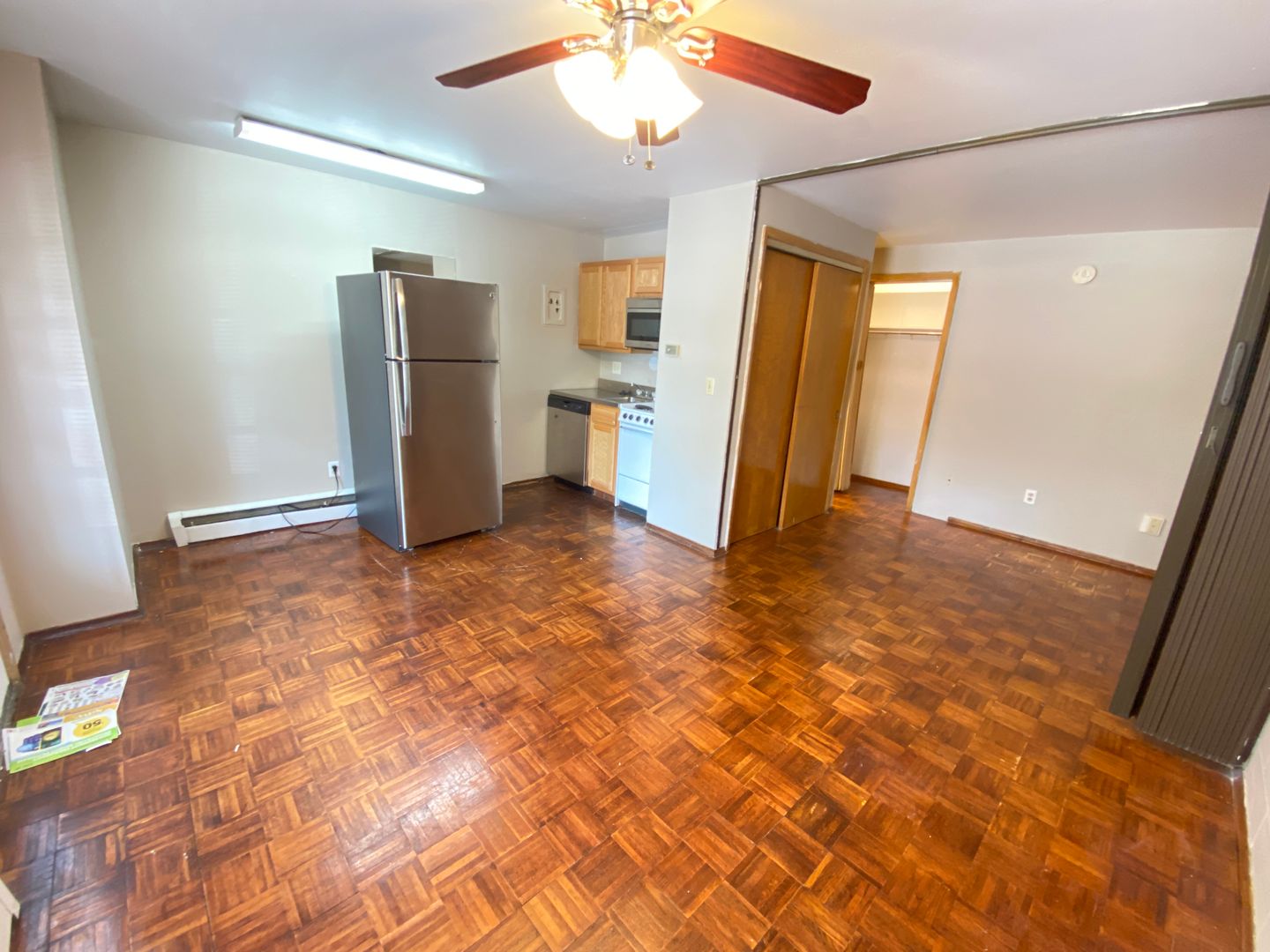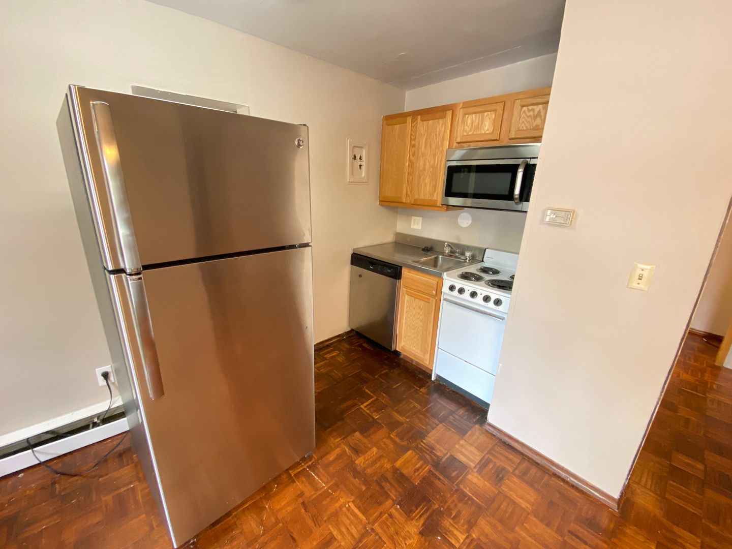 It features parquet hardwood floors, an efficiency-sized kitchen equipped with a stainless steel refrigerator and dishwasher.