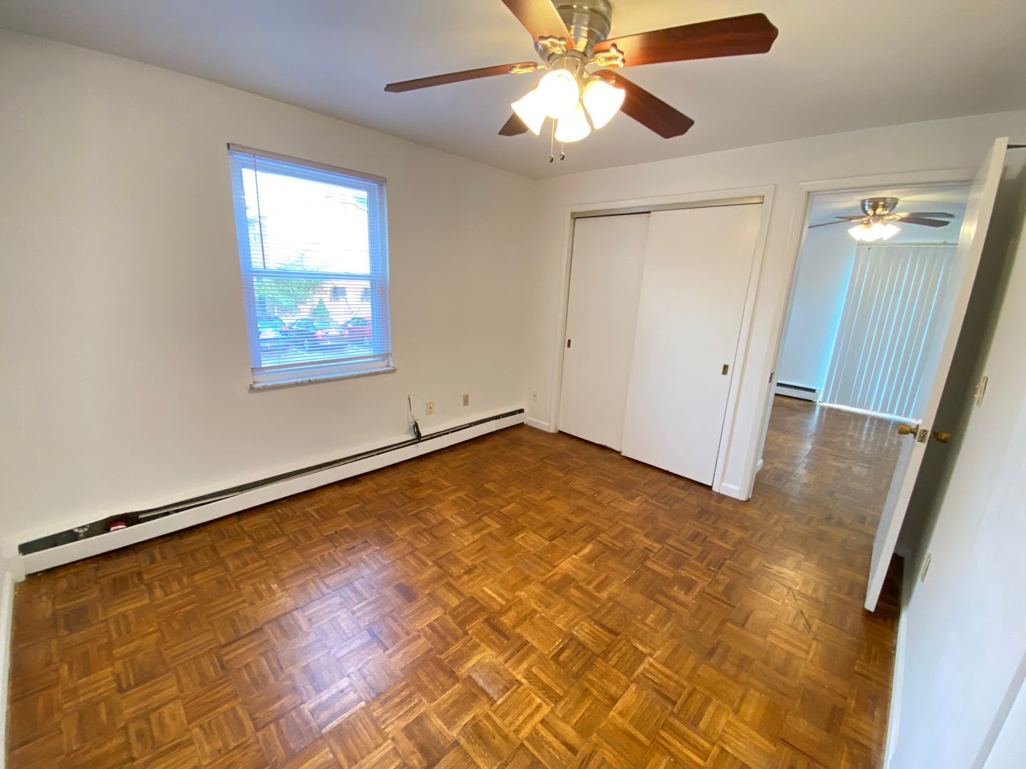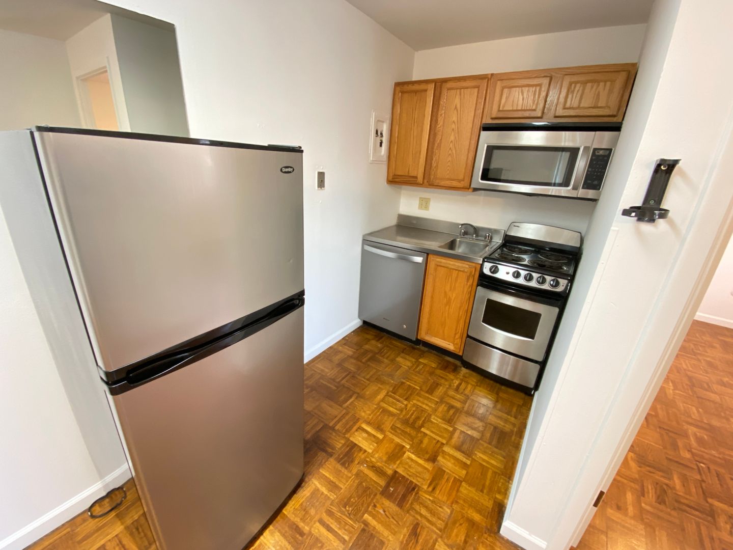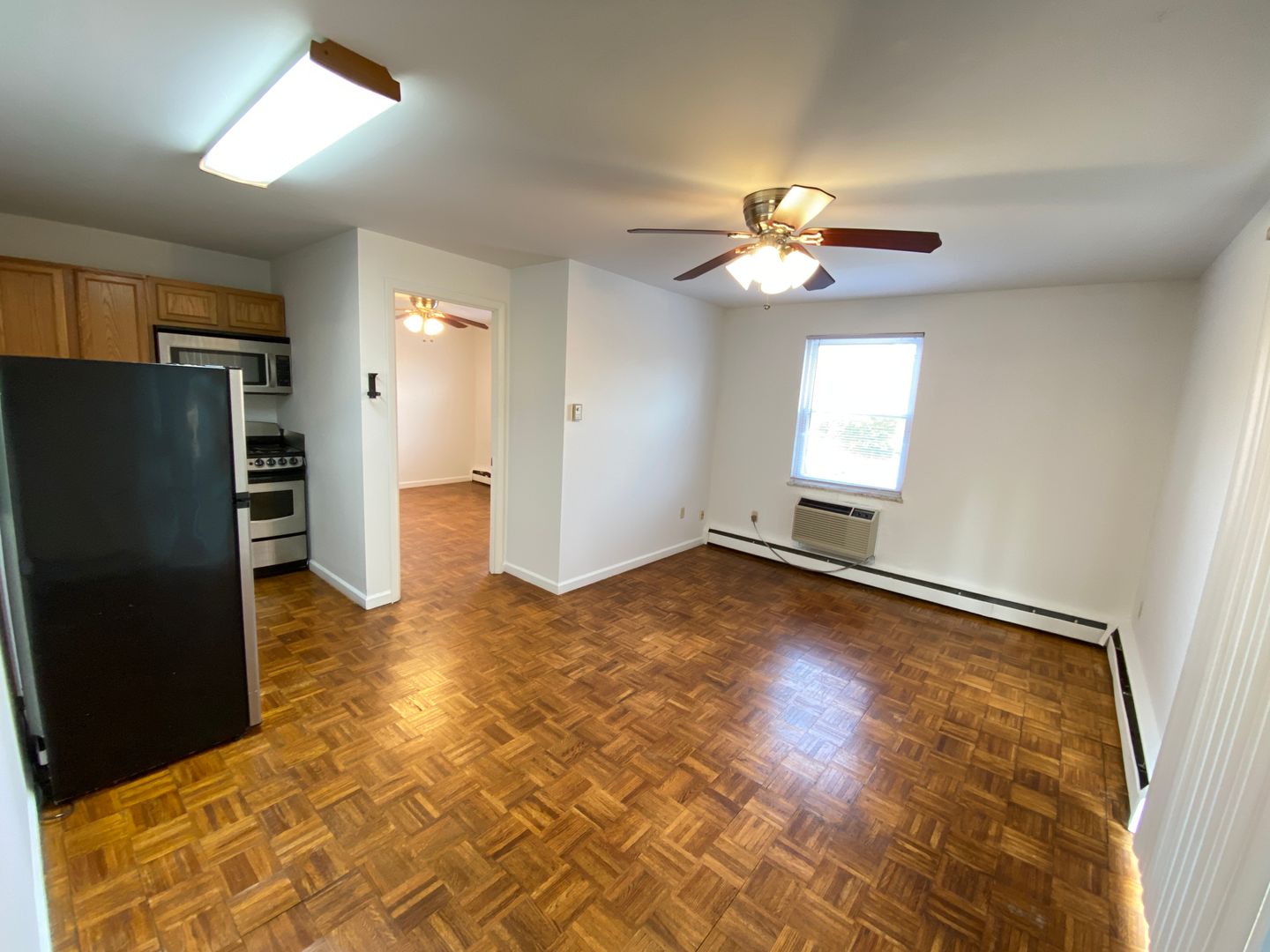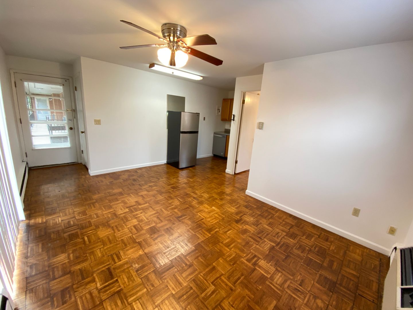 Great location on One way street , Step out on the private balcony and relax while you read or work. Additionally, there is a washer/dryer on-site and off-street parking available. Kitchen is complete with a stainless steel refrigerator and built in microwave. has AC and fans, parquet floors and is available now