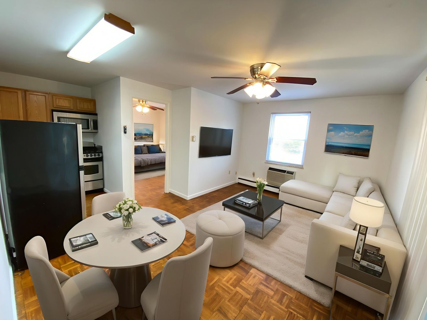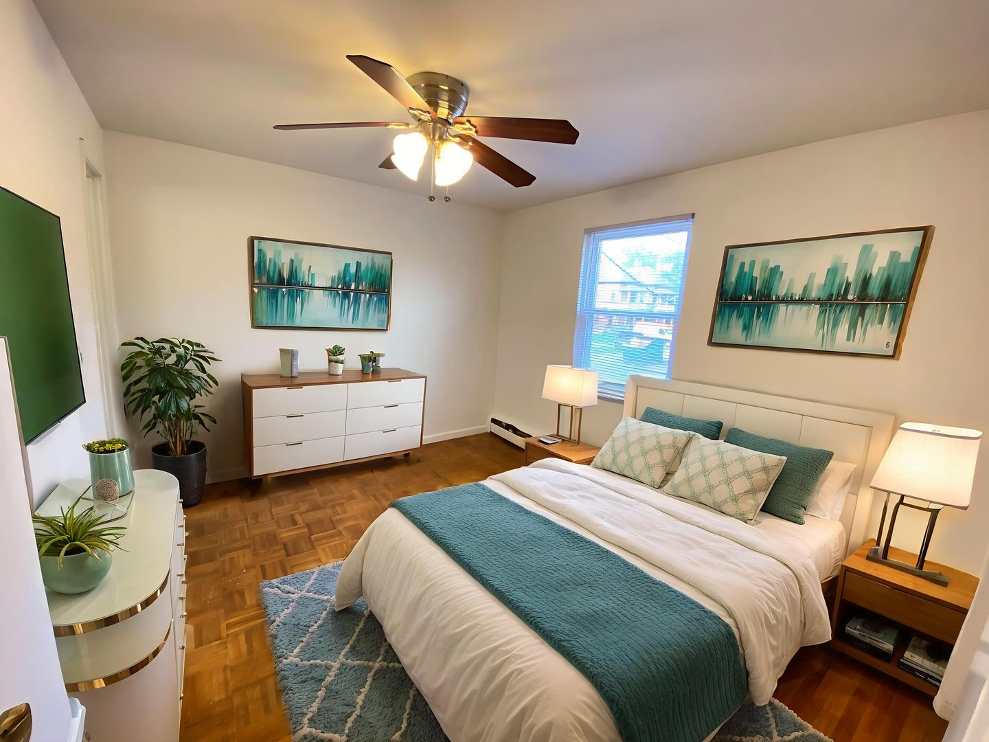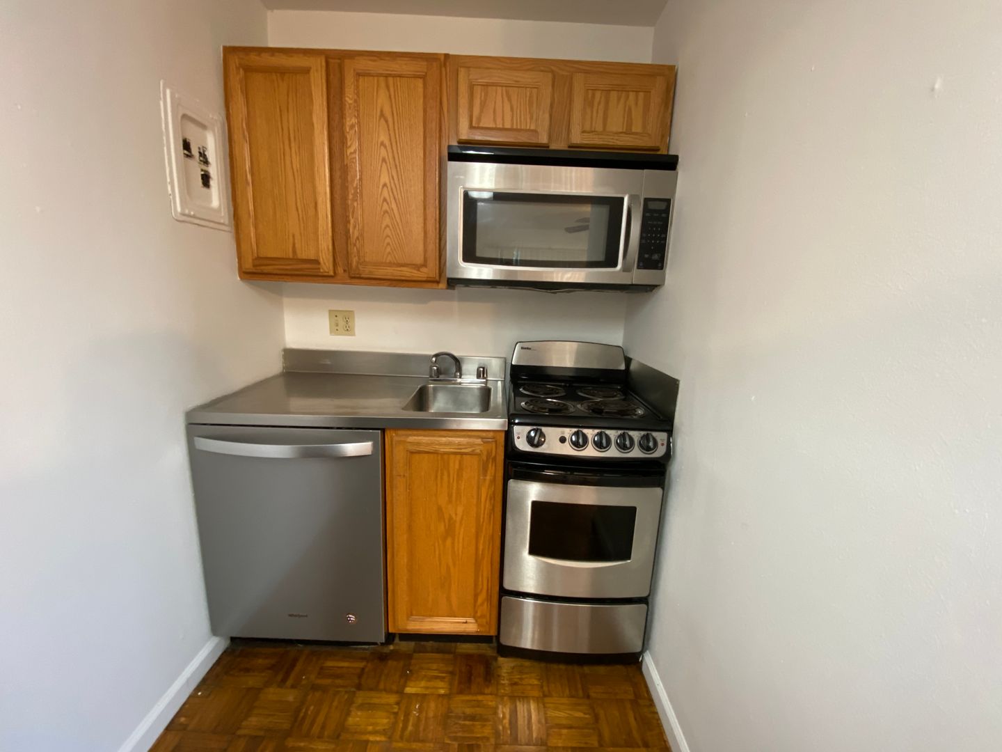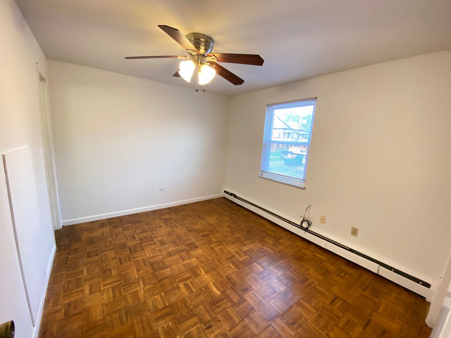 Great location on One way street , Step out on the private balcony and relax while you read or work. Additionally, there is a washer/dryer on-site and off-street parking available. Kitchen is complete with a stainless steel refrigerator and built in microwave. has AC and fans, parquet floors and is available now