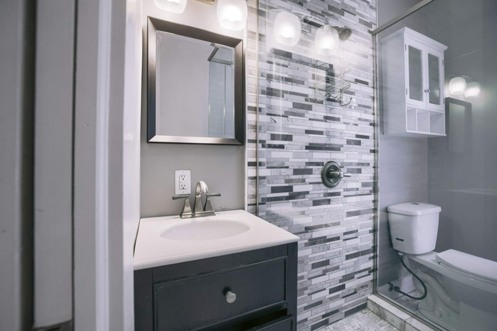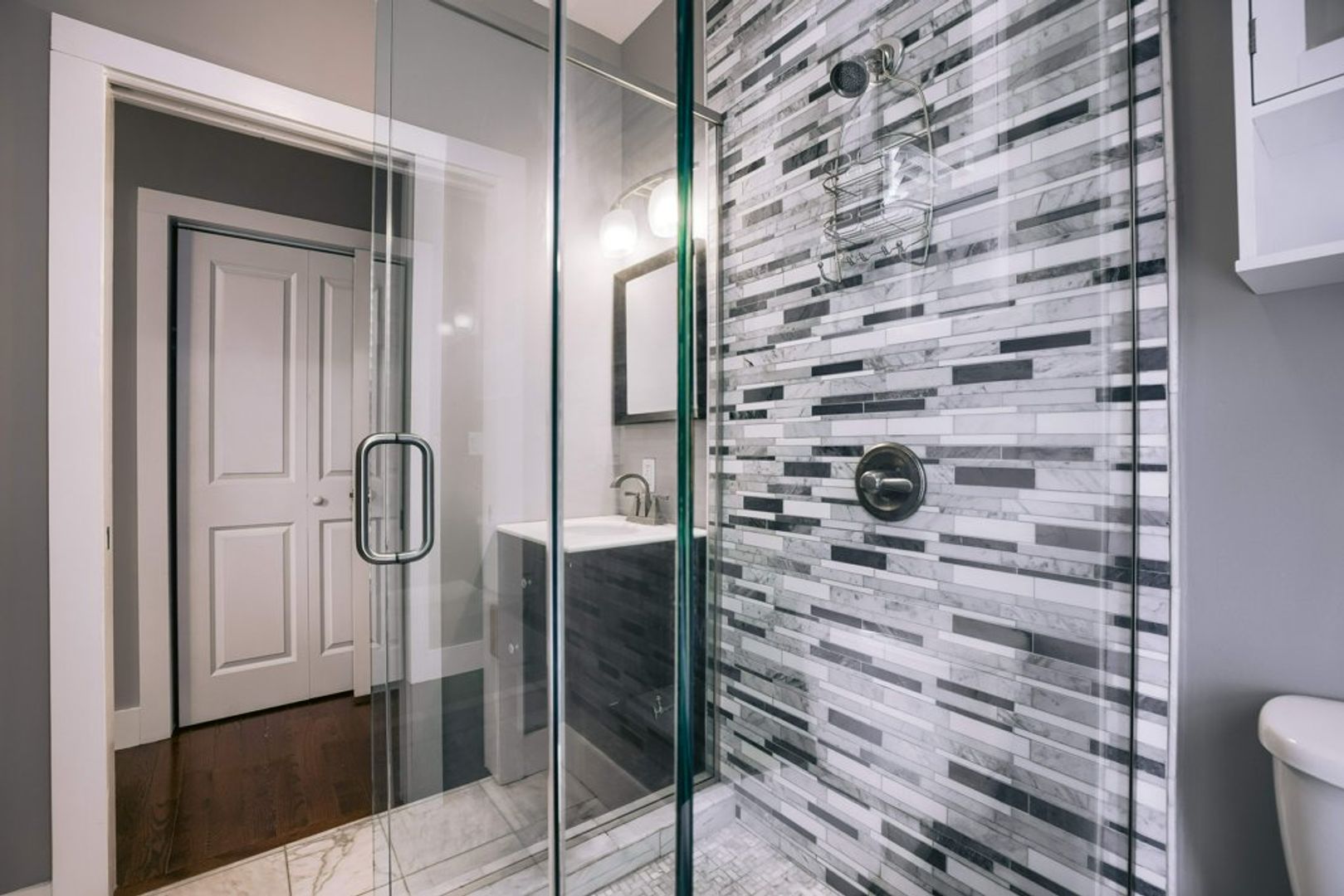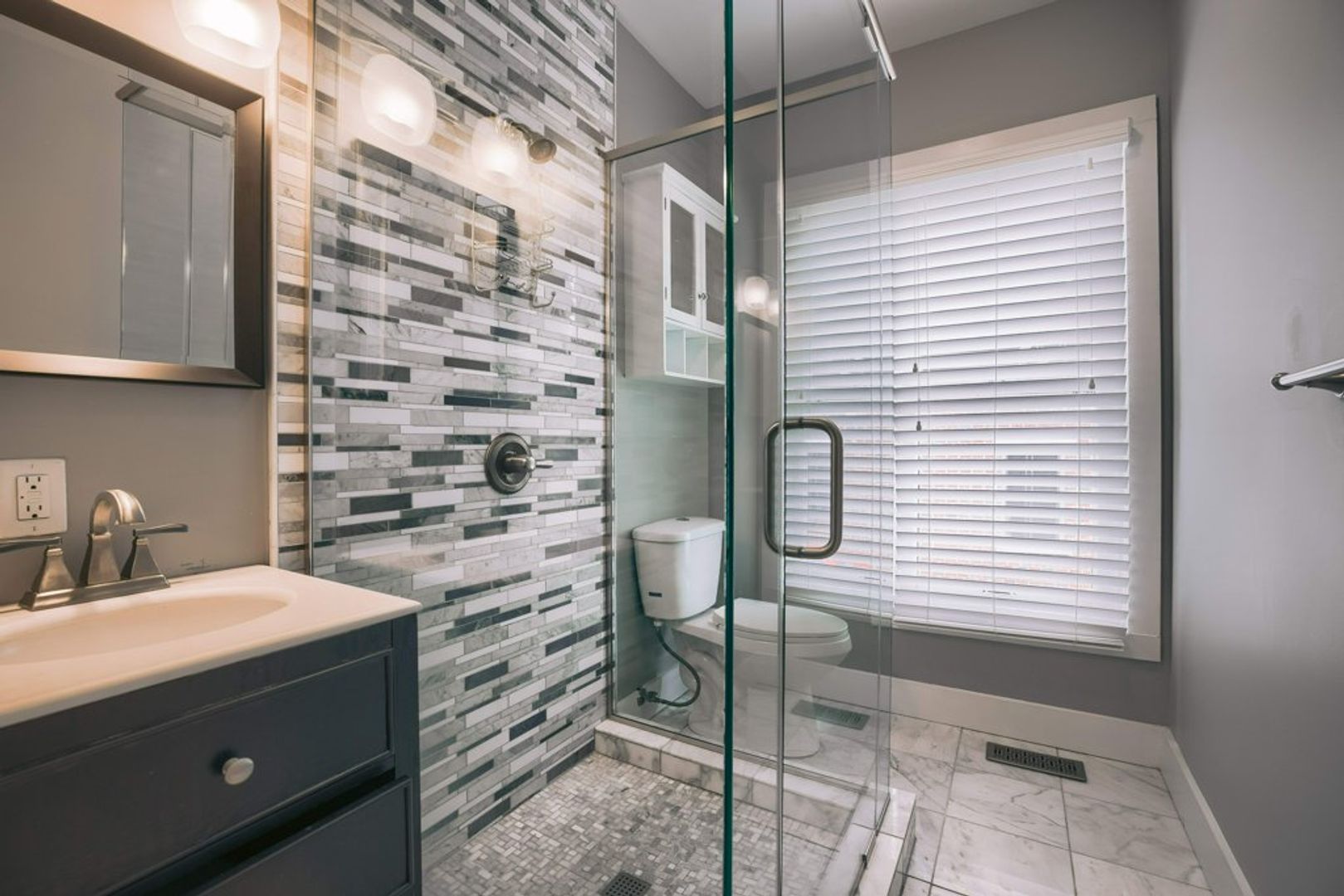 2.5 bathrooms with marble finishes and custom frame-less glass shower doors.