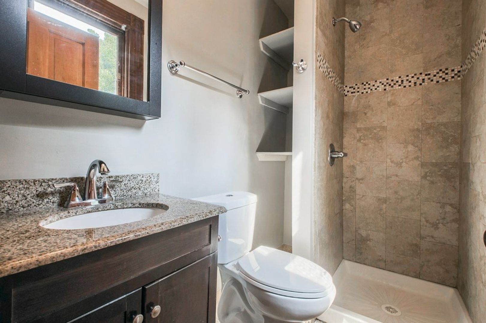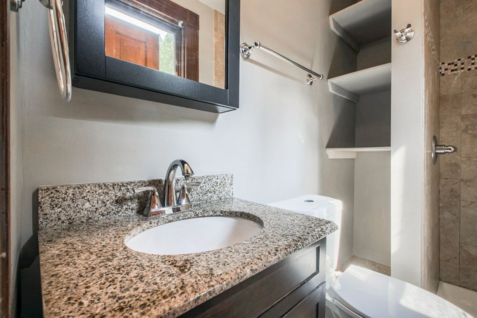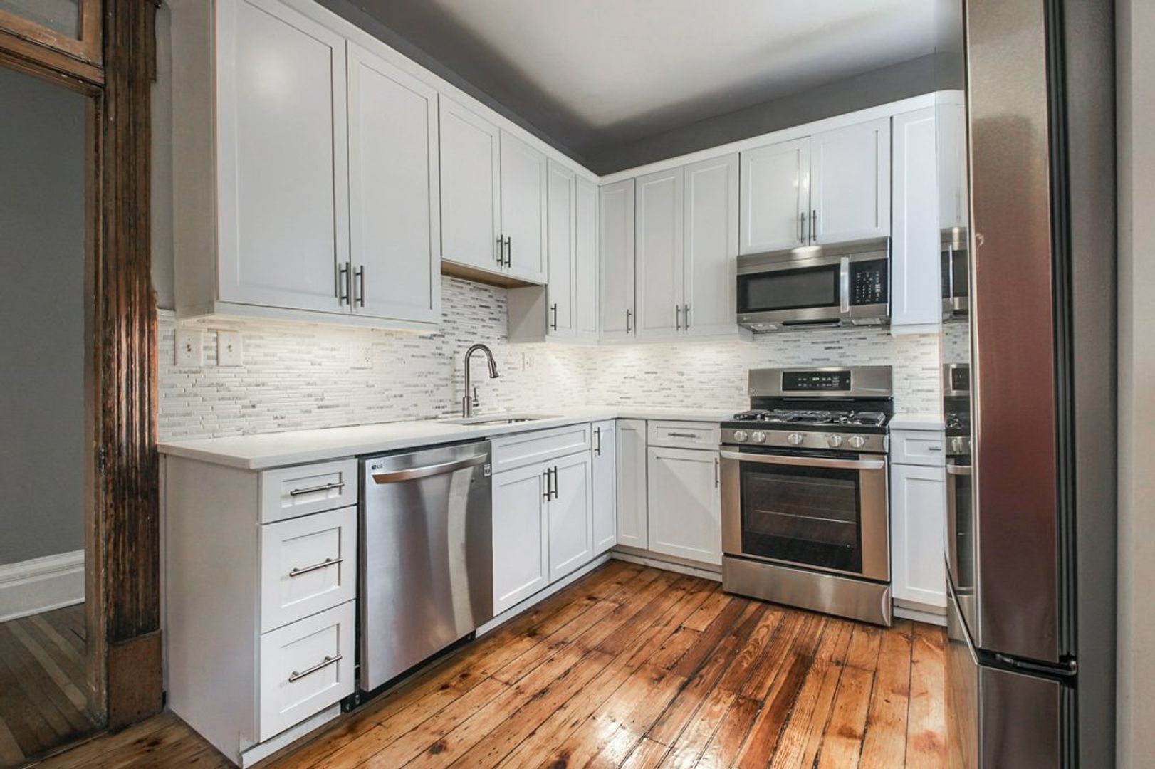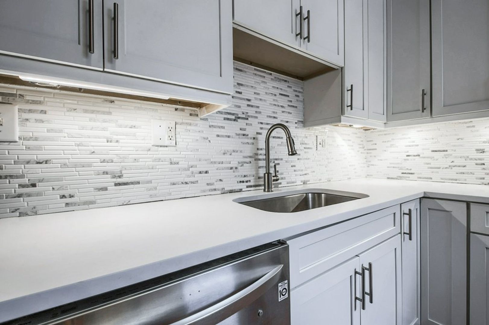 The kitchen has white quartz countertops, stainless steel appliances, marble mosaic backsplash, and beautiful white cabinets with lighting wired in. Don't miss out on this one of a kind rental.