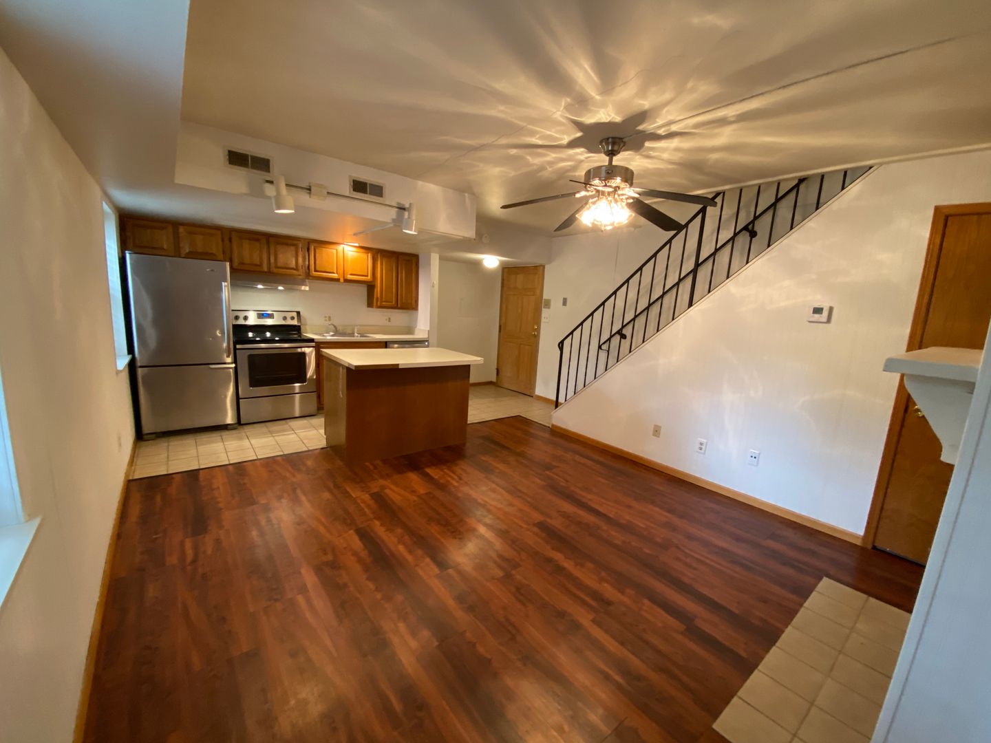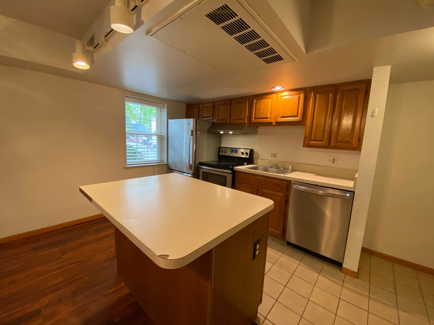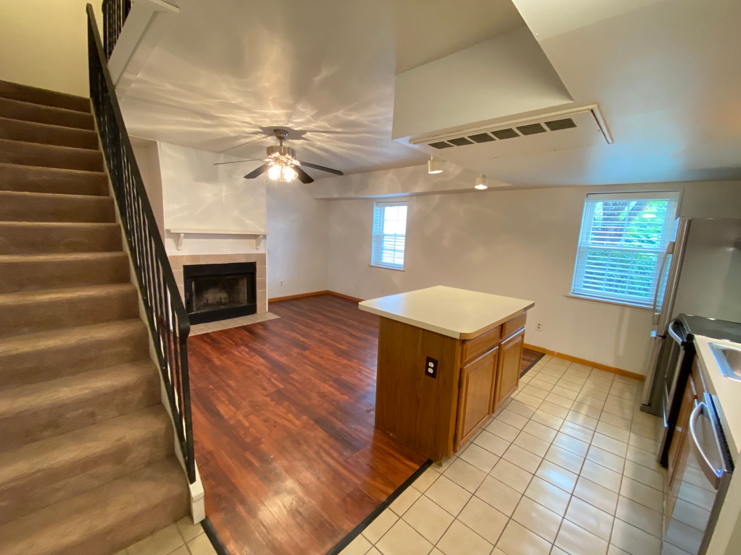 This modern 2 bedroom townhouse features an spacious living and bedroom areas, a decorative fireplace, bathroom with spa style tub. Kitchen includes an island and dishwasher.