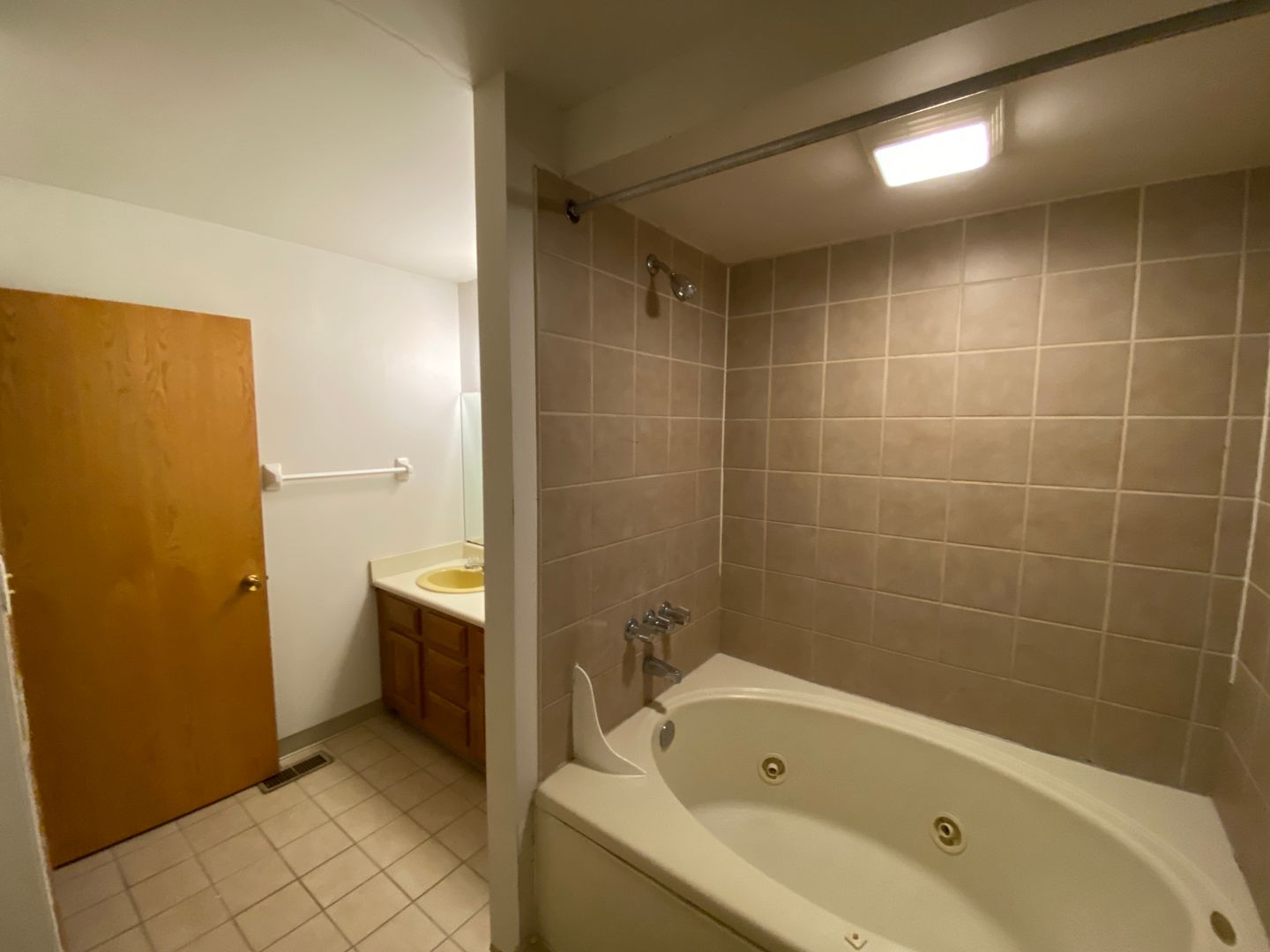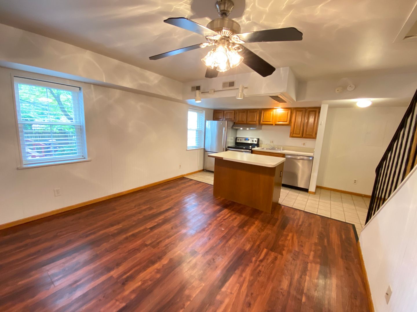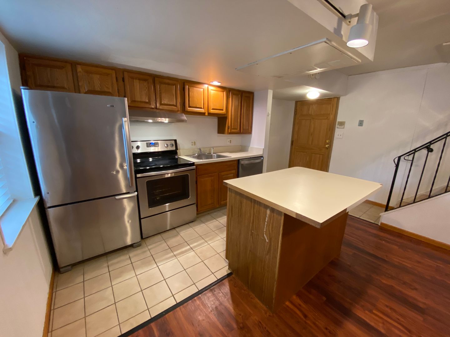 This modern 2 bedroom townhouse features an spacious living and bedroom areas, a decorative fireplace, bathroom with spa style tub. Kitchen includes an island and dishwasher.