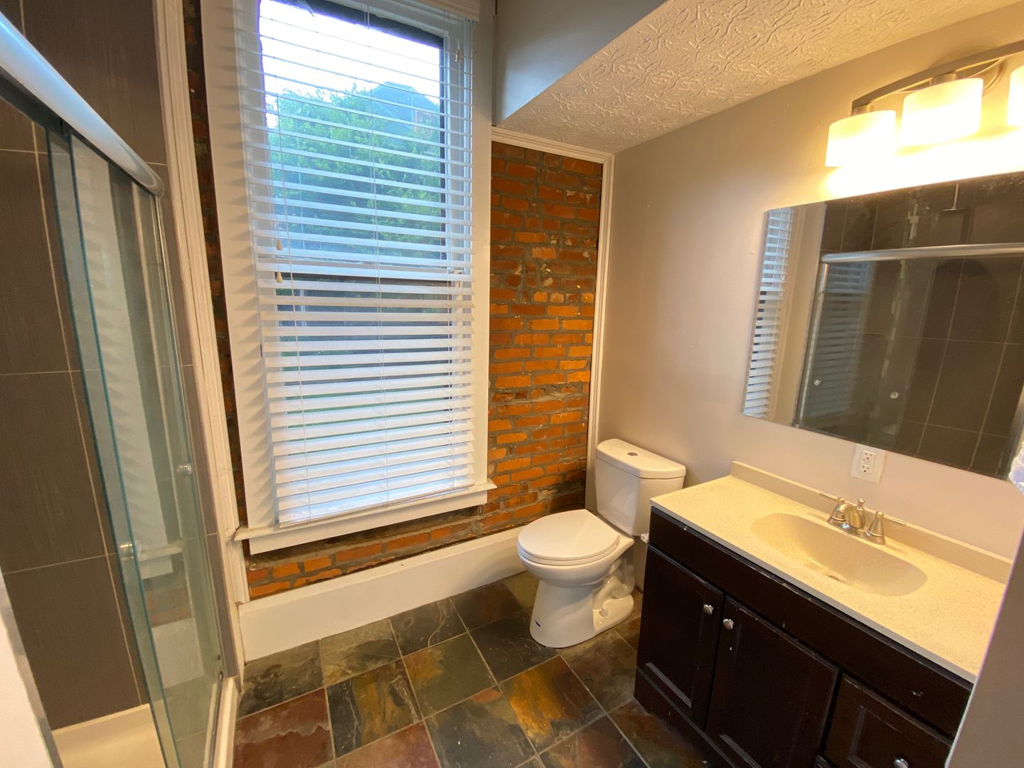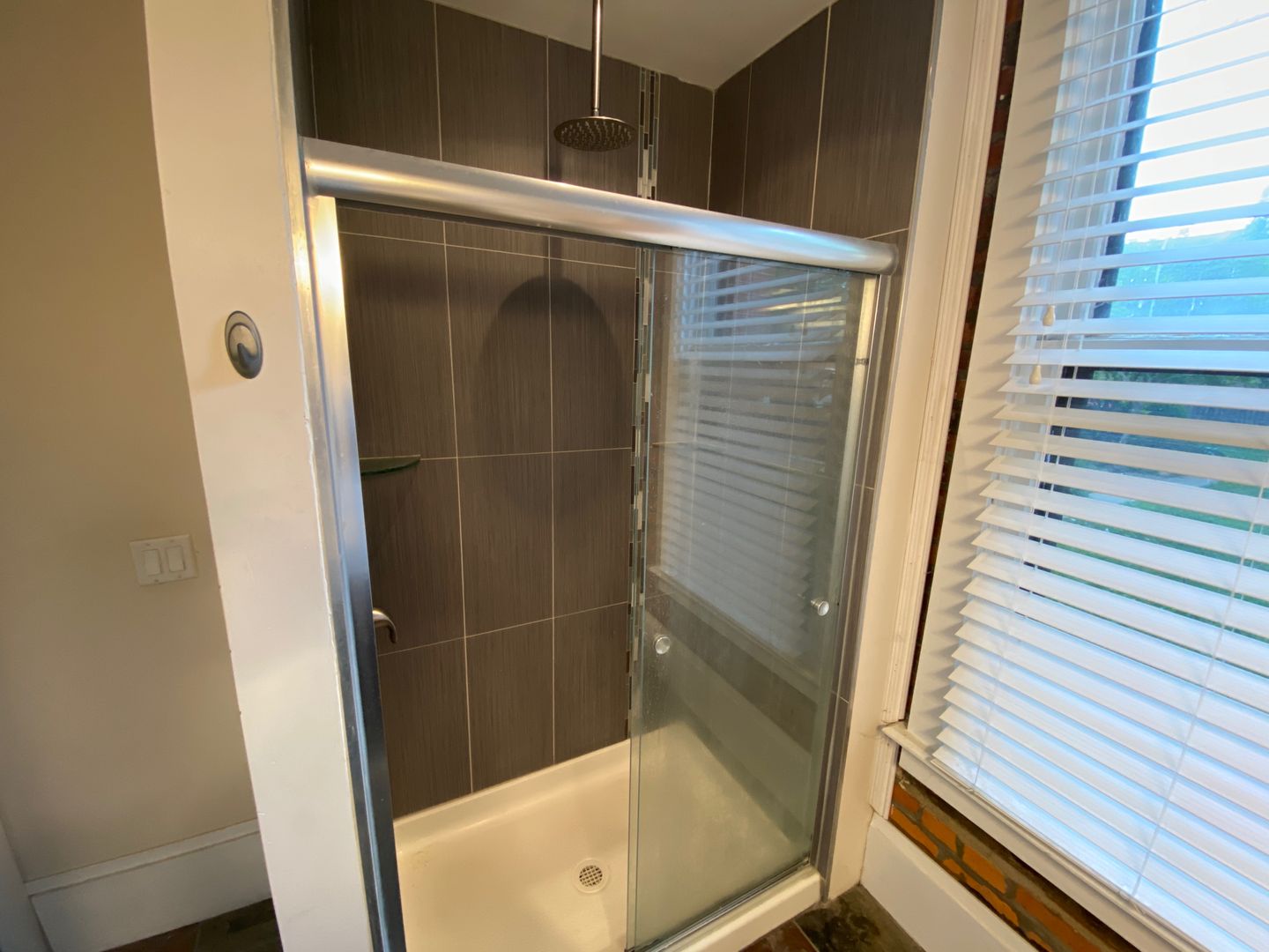 Tile shower with glass shower door and large vanity in the bathroom.