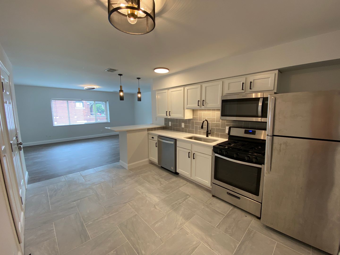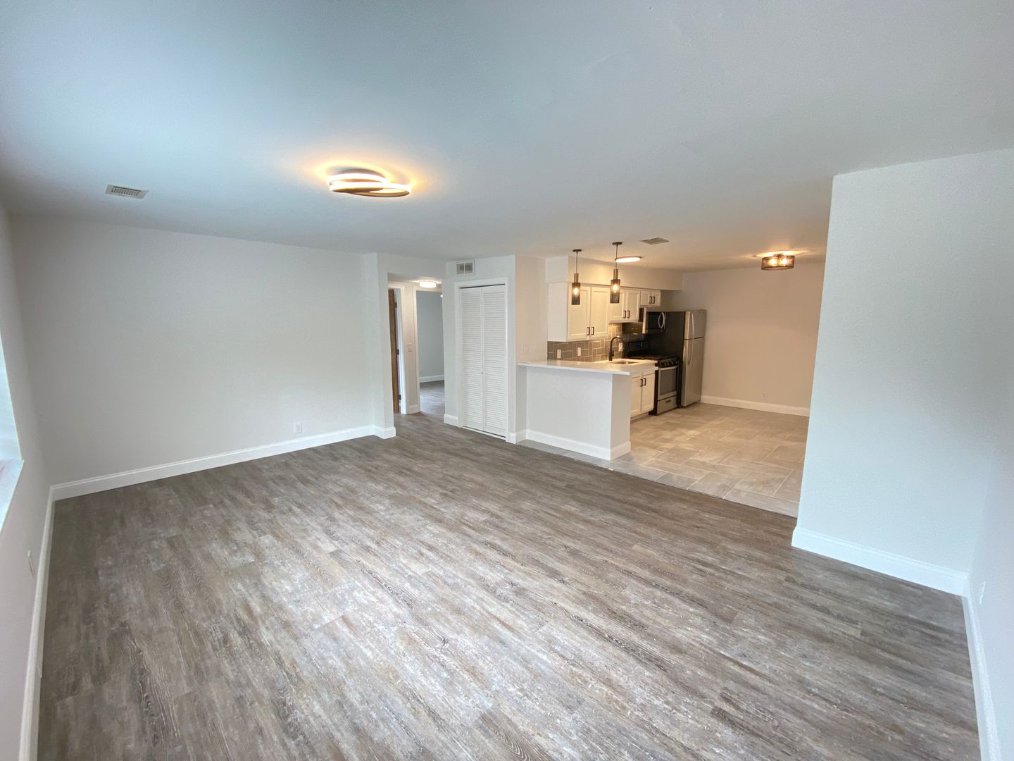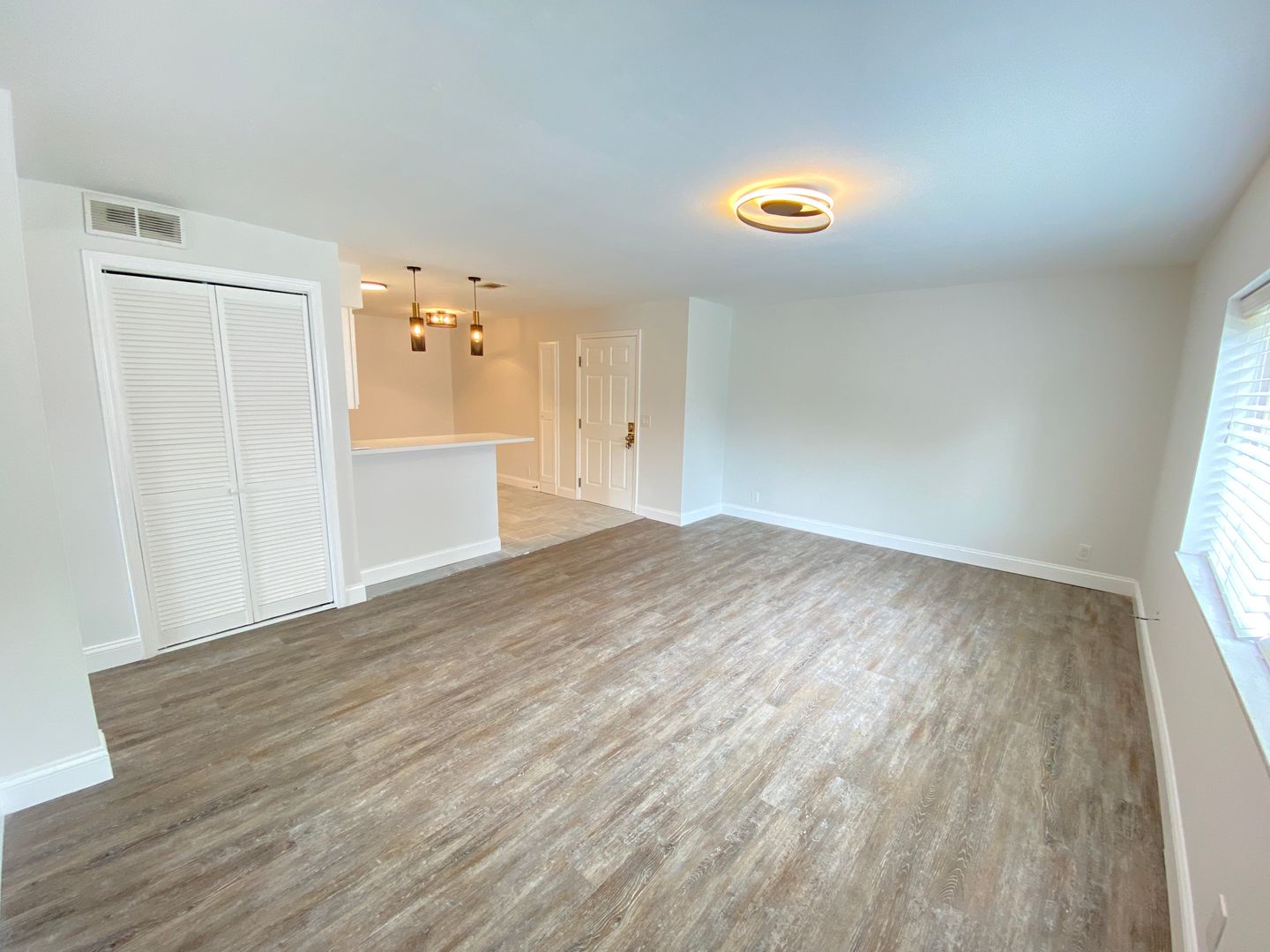 This apartment has a large, open floor plan with a dine-in kitchen.