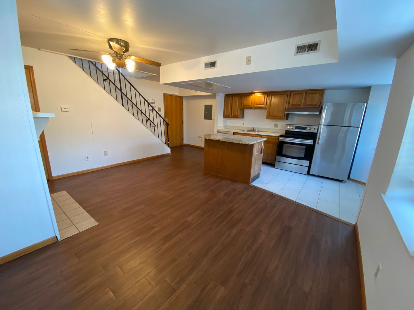 This modern 2 bedroom townhouse features a kitchen with an island and dishwasher. Spacious living and bedroom areas, bathroom with ceramic and spa-style tubs. The townhouse also has a bonus room/ office. Off-street parking is available for purchase!
