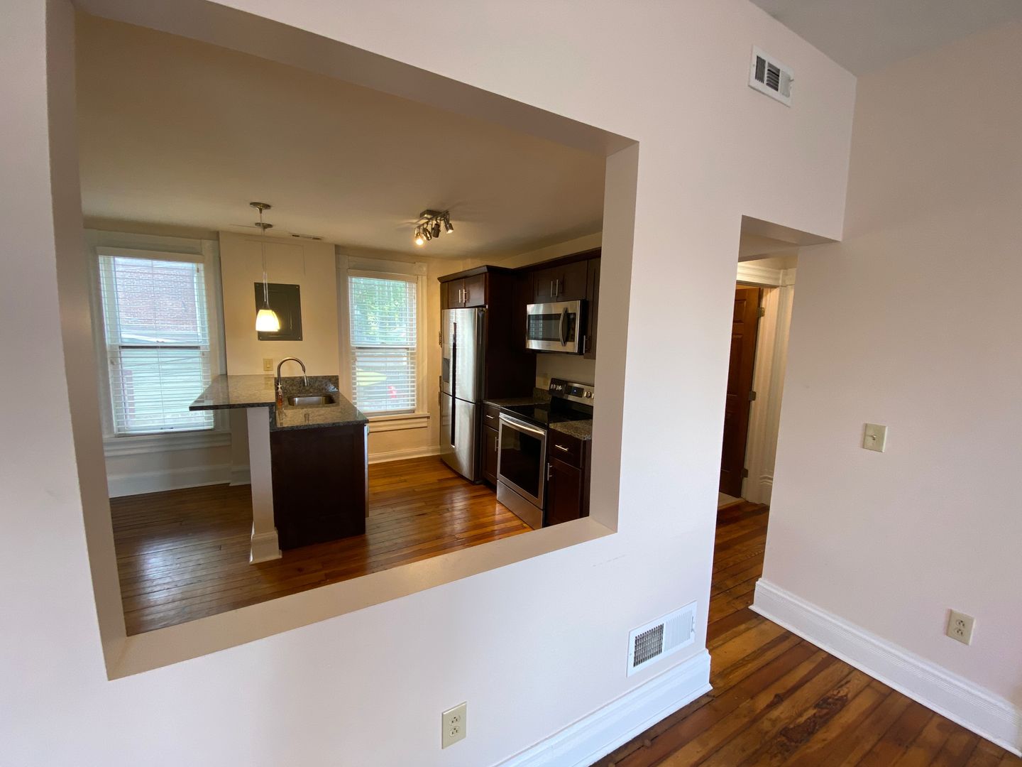This two-bedroom, one-bathroom apartment is a perfect blend of comfort and style. The unit boasts central air conditioning, ensuring a comfortable living environment all year round. The kitchen is a chef's dream, equipped with stainless steel appliances, a built-in microwave, and granite counters that add a touch of elegance.