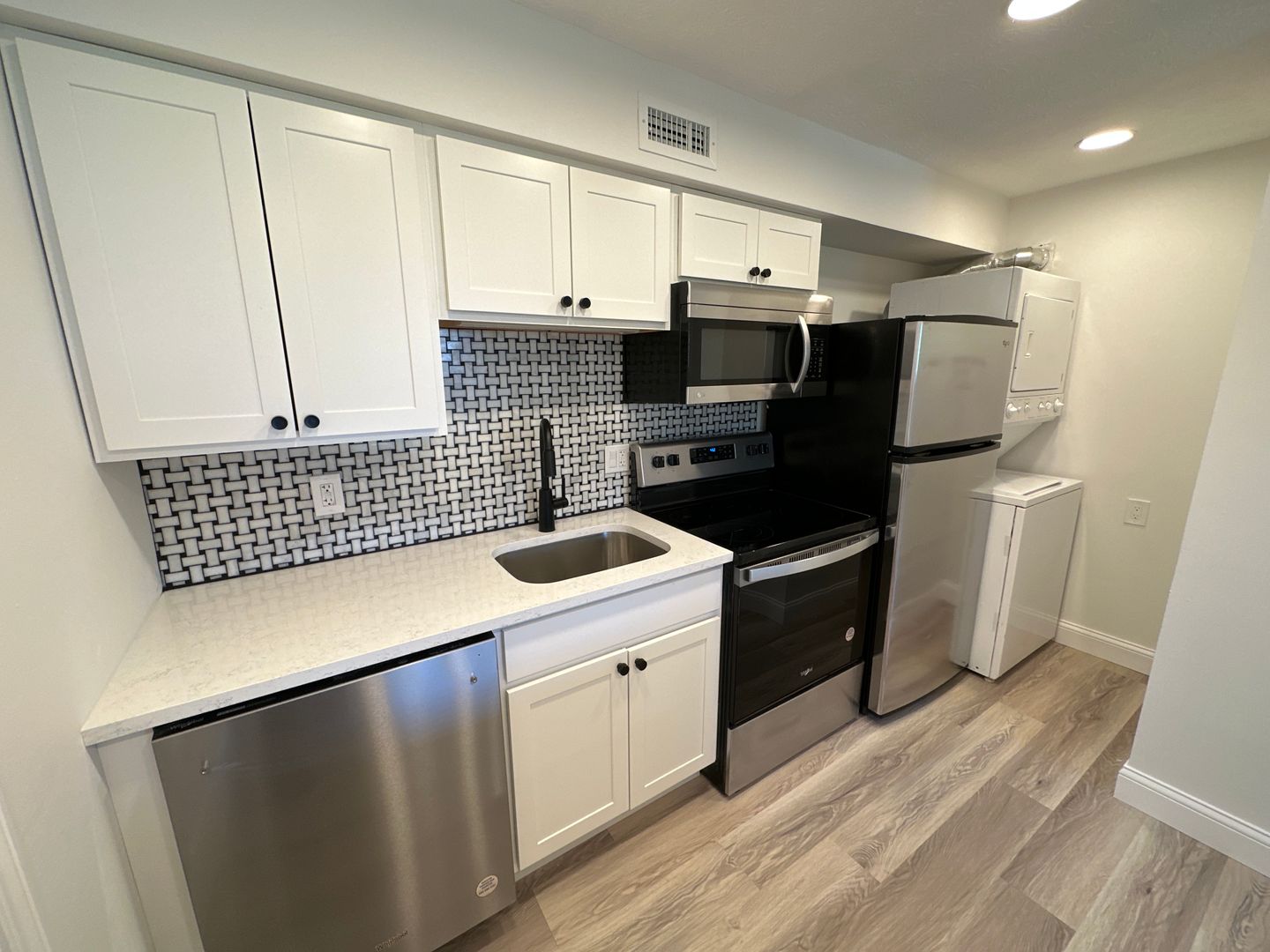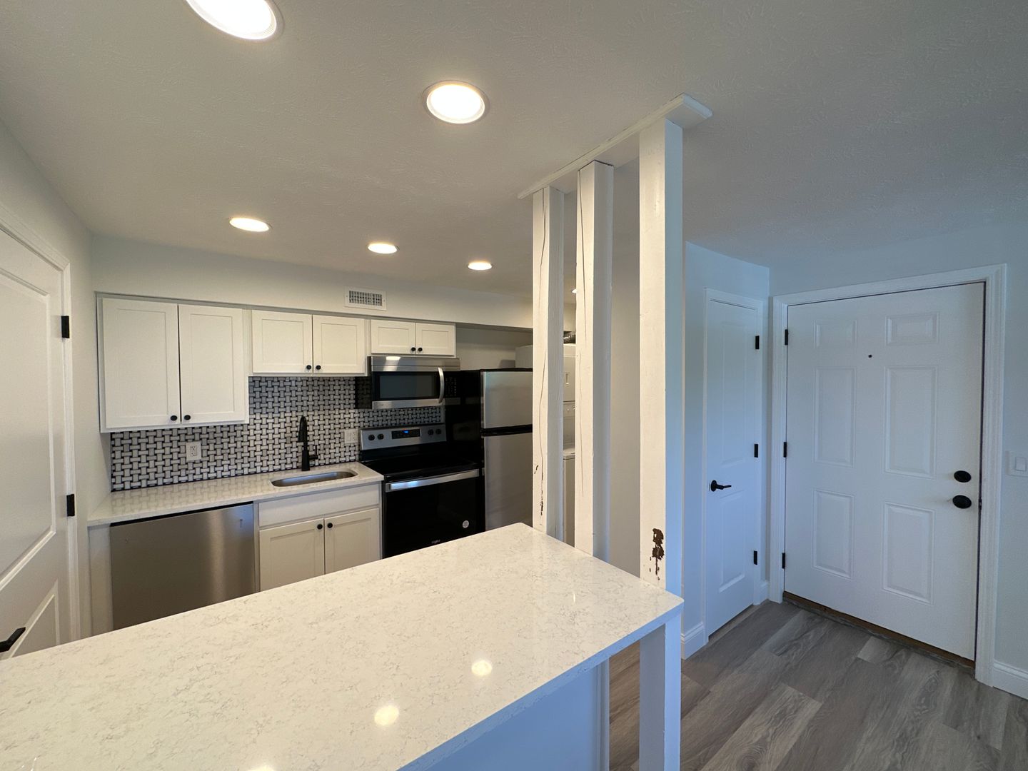 This apartment has everything you need - a large living room, beautiful renovations throughout ¢tral A/C. The renovated kitchen includes a breakfast bar, dishwasher, stacked washer/dryer µowave!